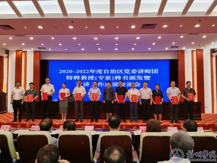 5月8日,自治区党委常委、宣传部部长范晓莉,自治区党委宣传部常务副部长孙大光、自治区党委宣传部副部长赵勇富向全区81位特聘教授专家颁发聘书。我校党委宣传部副部长唐景成教授(右二)在仪式上接受聘书。