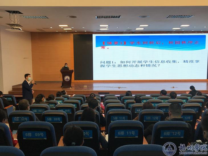 会上,学生工作部(处)对我校出台的“两案13制度”文件、疫情应急处理流程进行了详细解读,并设置8个模拟场景现场进行了桌面推演。同时,围绕设置的模拟问题,各二级学院分管学生工作副书记逐一进行了回答。