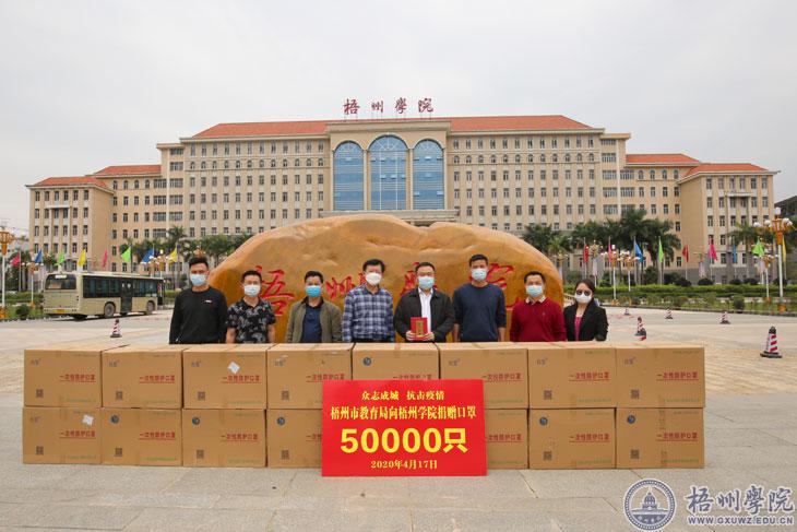 4月17日上午,梧州市教育局局长覃颂代表梧州市教育局向我校捐赠一次性医用口罩5万只,价值12.5万元。捐赠仪式在学校东大门举行,学校党委书记唐平秋代表学校接受捐赠物资。