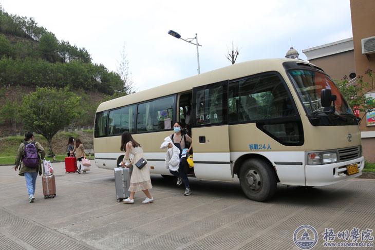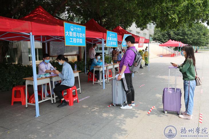 学校为迎接学生返校做足贴心的接待工作。学校安排车辆在梧州南站、火车站、汽车站等各个站点进行接站。所有返校学生集中在体育馆前广场进行体温检测、行李消毒、验证绿码等且合格后方可进行报到注册。在报到过程中,学校为每个学生发放口罩、《新冠肺炎预防知识》《新冠肺炎防控心理自助手册》等物资和材料,教育和引导学生做好日常的安全和防范工作。完成报到注册后,学校安排校内调度车辆送学生到每幢宿舍楼前。返校后,学校还将在返校学生中全覆盖开展《疫情防控教育开学第一课》。