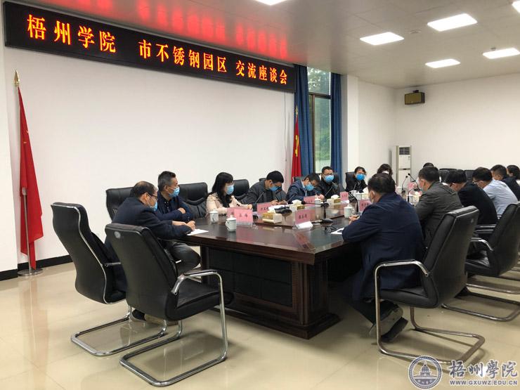 座谈会上,不锈钢园区管委会主任刘杰介绍了不锈钢产业在梧州发展的情况,希望梧州学院能够充分发挥人才优势和教学科研资源优势,进一步推进科学研究、科技创新和产学研合作。宾月景表示,我校一直致力于为地方经济和社会科技发展服务,与政府部门合作搭建平台是我校深化校企合作工作,提升服务地方经济发展水平的一项重点工作,今后我校将继续加强与政府部门沟通,共建政校合作平台,以平台为纽带,将政、校、企之间联系更加紧密,实现合作共赢。
