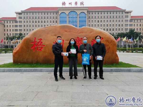 3月17日上午,我校食堂冻肉冻品类物资供应商梧州市斌华商贸有限公司向我校捐赠了250个医用口罩和2支红外探温枪,校长助理、后勤基建处处长覃雄彪代表学校接受捐赠。