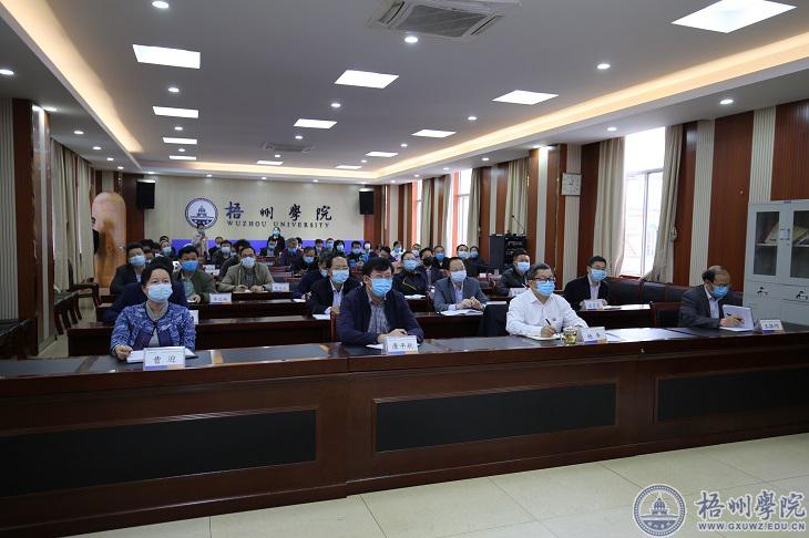 学校在明理楼七楼视频会议室设分会场。学校领导唐平秋、杨奔、曹迎、玉振明、邱房贵、梁业华、麻新纯、宾月景,学校各单位、部门主要负责人在分会场参加会议。