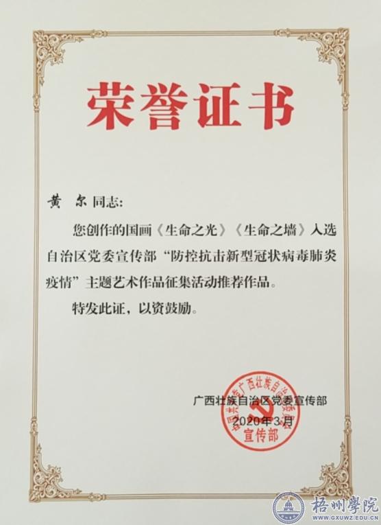 自治区党委宣传部将从征集作品中遴选优秀作品在省级宣传平台进行发布推广,并积极向中央媒体推荐。我校宝石与艺术设计学院黄尔老师在疫情期间创作的两幅幅美术作品《生命之光》《生命之墙》(中国画)入选。