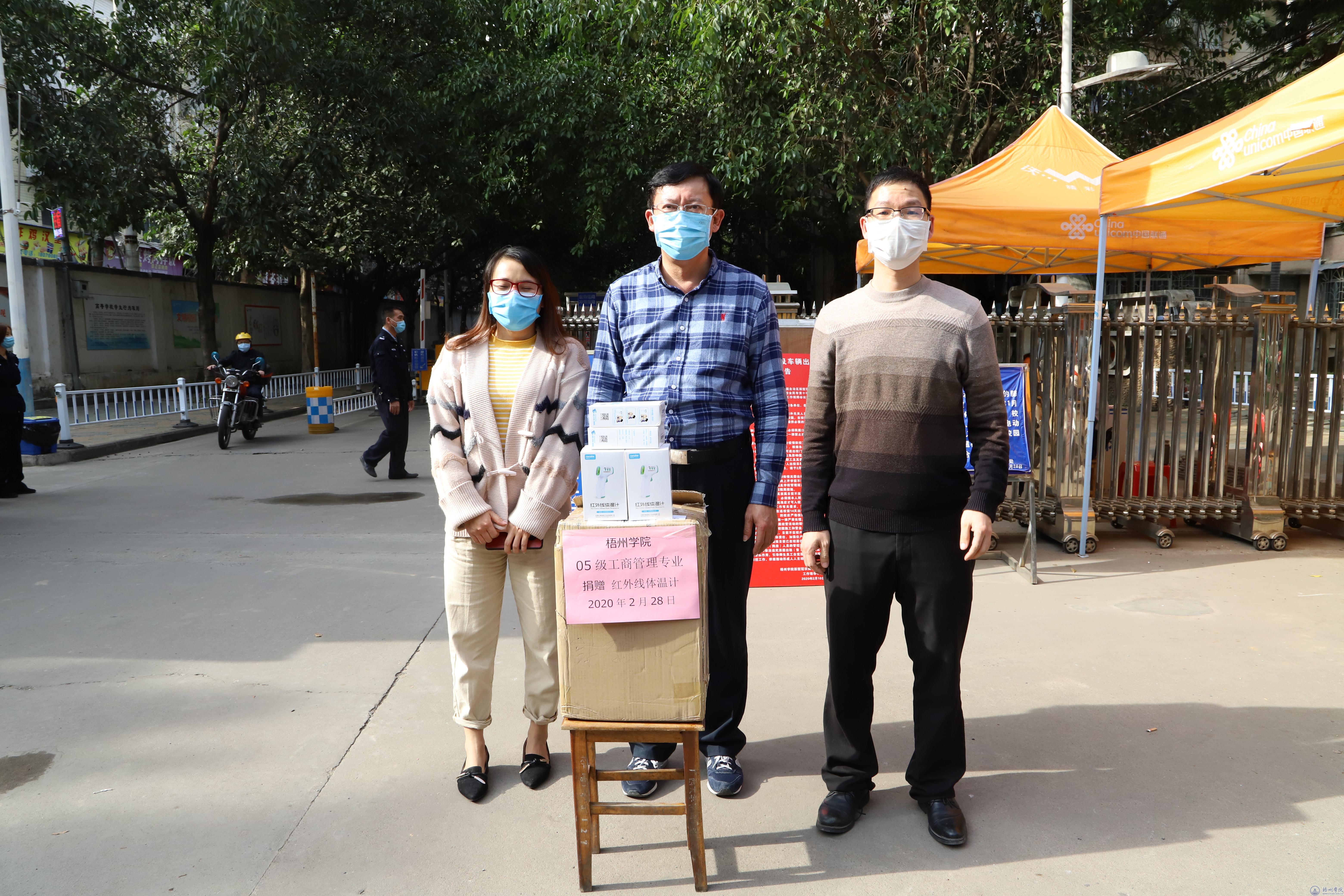 2月28日下午,我校收到了由2005级工商管理专业本科班校友集体捐赠的疫情防控物资红外测温枪44支,价值2万2千元。捐赠仪式在学校南门举行,学校党委书记唐平秋,校友工作办公室、国有资产管理处负责人和2005级工商管理专业本科班校友代表徐泽、邱媚等出席。