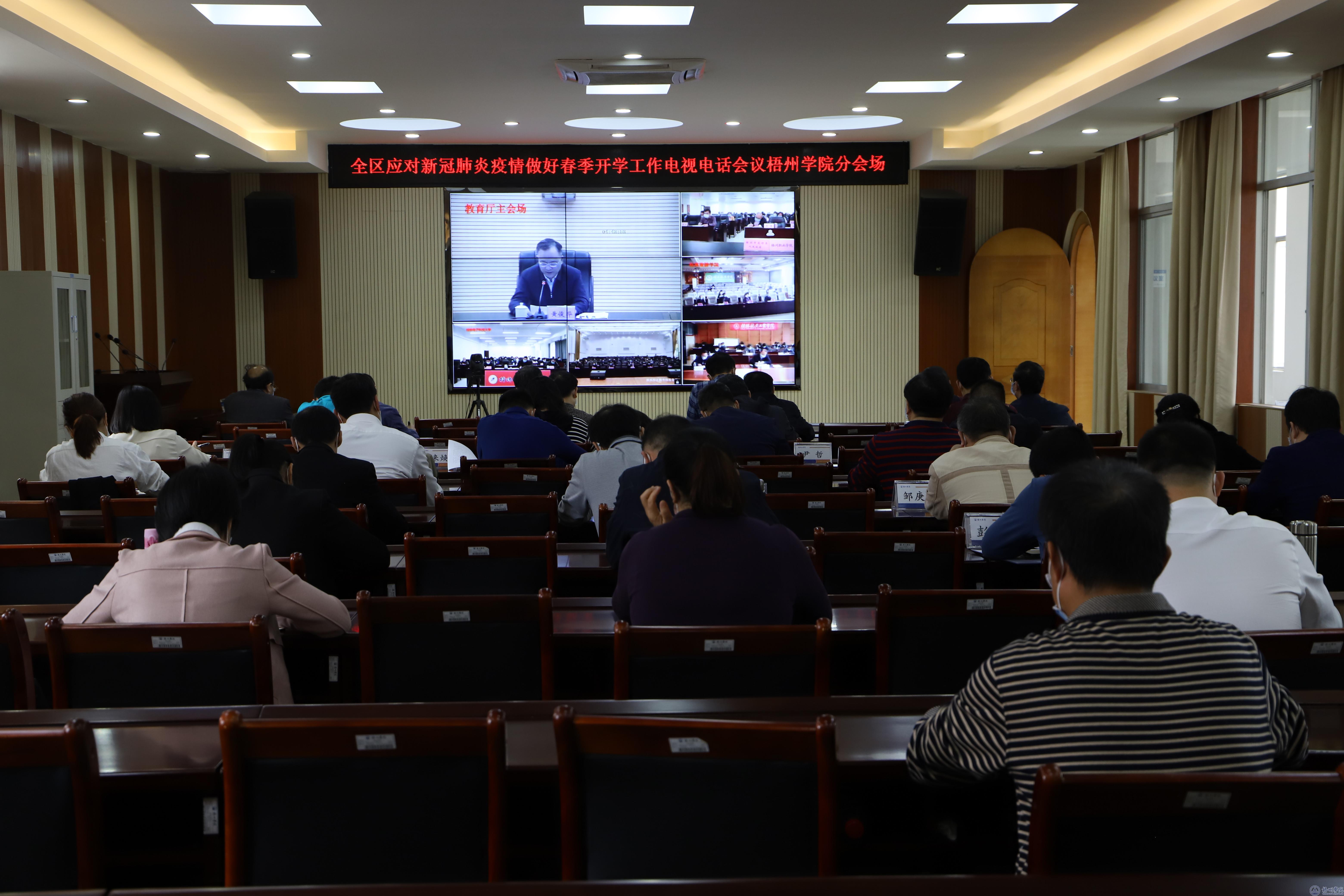 学校在明理楼视频会议室设分会场,学校领导唐平秋、杨奔、曹迎、玉振明、邱房贵、梁业华、麻新纯、宾月景,学校疫情防控工作领导小组指挥部领导小组成员以及各组组长在分会场参加视频会议。