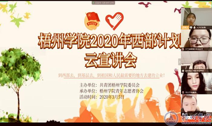 3月5日晚,梧州学院2020年西部计划云宣讲通过腾讯会议App平台在线上举行,会议邀请了我校往届分别在西藏、四川和广西参加西部计划志愿服务的陈自良、罗东平、彭祥轩三位校友作为宣讲人,共有150多名毕业生参加。