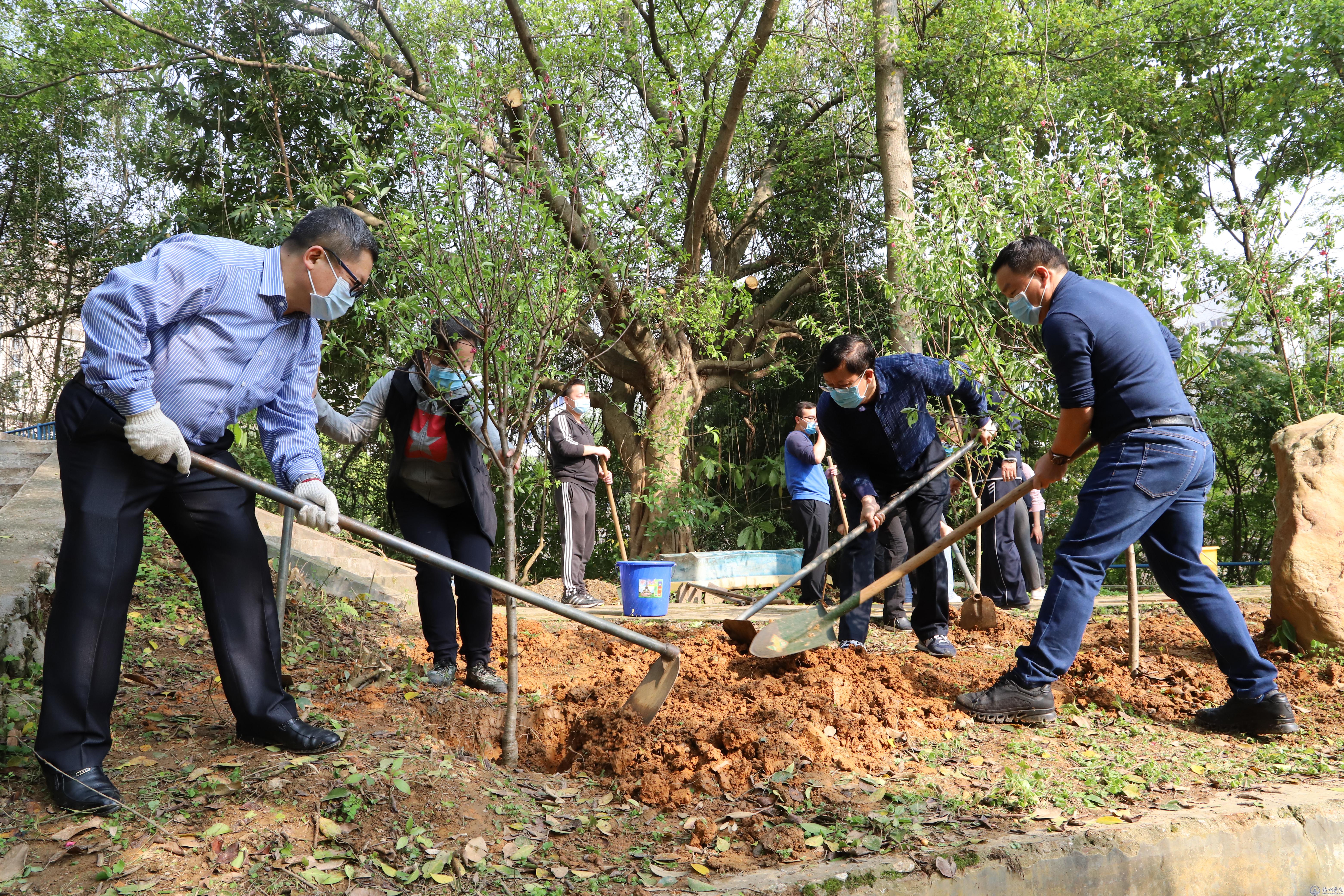 植树活动结束后,学校领导唐平秋、杨奔、玉振明及后期基建处负责人实地调研校园绿化情况,对今年春季植树工作进一步部署和落实。