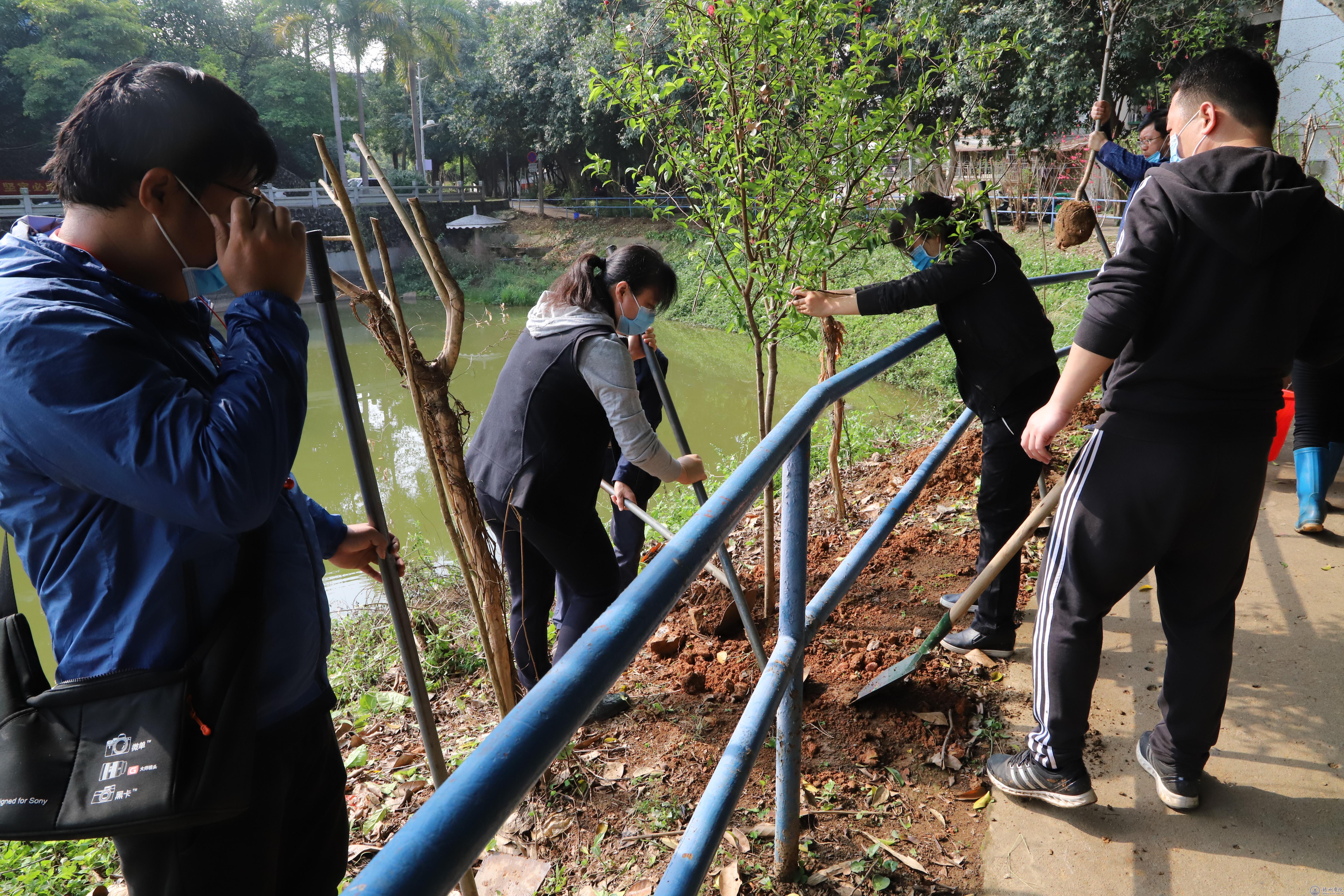 大家拿起铁锹和锄头,共同扶苗、培土、浇灌,在桃花岛沿岸种下了40株桃树。