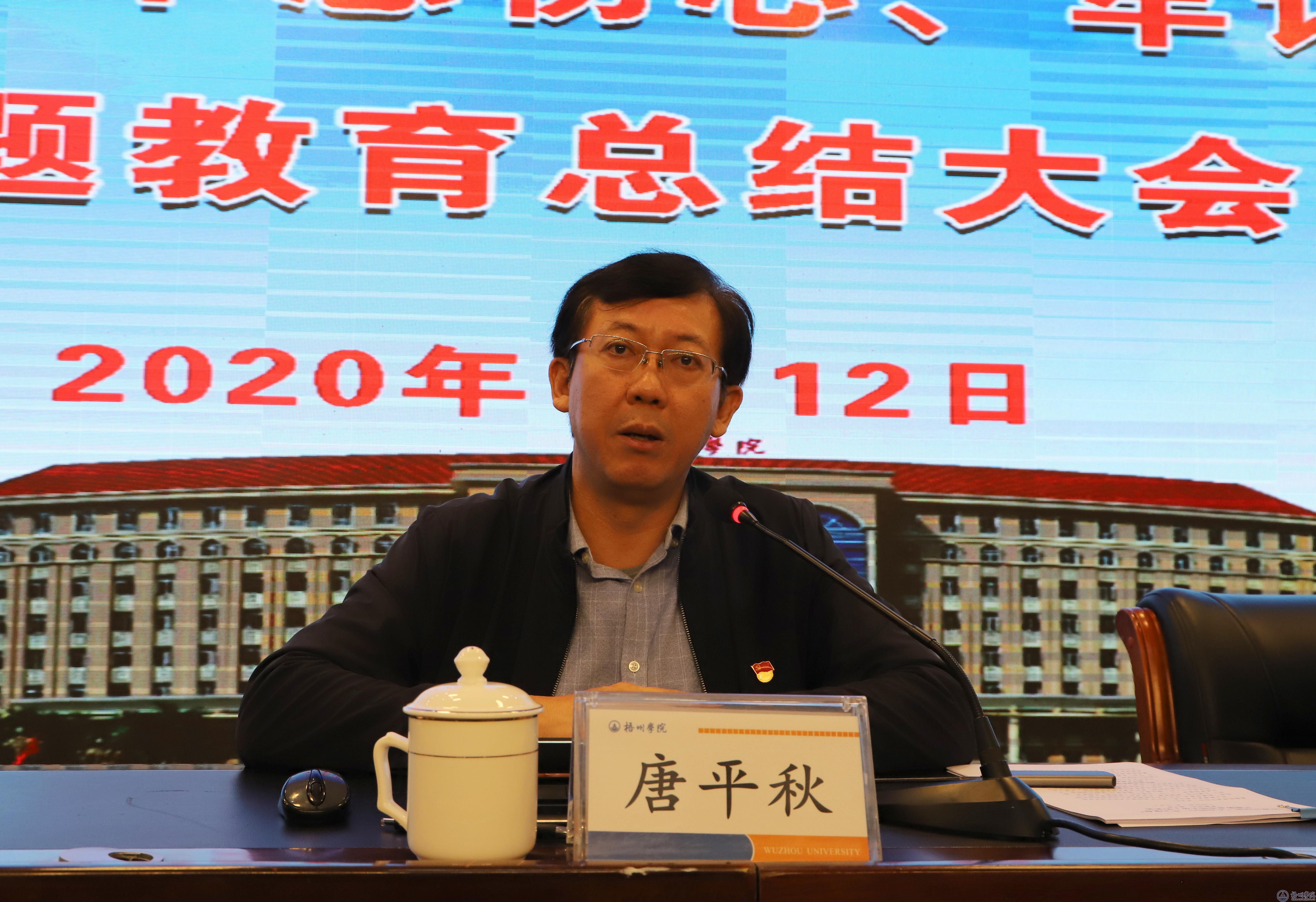 校党委书记唐平秋作主题教育总结讲话。他指出,全校各级党组织及党员干部以饱满的政治热情、严实的工作作风、良好的精神状态投身到主题教育中去,达到了预期目的,取得了扎扎实实的成效。通过主题教育,我们增强了政治定力、提升了学习力、提升了执行力、激发了创新力、实现了党建与业务双融合双促进、政治生态得到进一步净化。针对存在的不足,他从学习深度力度还有差距、思想解放创新还有差距、责任担当作为还有差距三个方面进行了剖析。他强调,各级党组织要及时跟进学,要知行合一、学以致用,把落实全国、自治区“不忘初心、牢记使命”主题教育总结大会精神作为增强“四个意识”、坚定“四个自信”、做到“两个维护”的重要途径和重要实践,持续在“不忘初心、牢记使命”主题教育上下功夫,使之成为加强党建的永恒课题和党员干部的终身课题;持续在学懂弄通做实上下功夫,深学笃用习近平新时代中国特色社会主义思想,使之在梧州学院落地生根、开花结果;持续在强化自我革命上下功夫,抓好主题教育各项整改任务落实;持续在建章立制上下功夫,不断完善学校治理体系;持续在营造良好政治生态上下功夫,推进全面从严治党向纵深发展;持续在加强党建上下功夫,充分发挥“关键少数”的“头雁效应”。