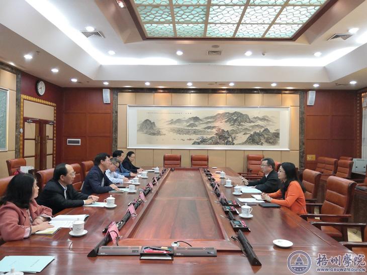 自治区人大常委会副秘书长严丽萍,学校副校长邱房贵,梧州市财政局副局长陈伊春,学校党委(校长)办公室、财务处负责人参加汇报会。