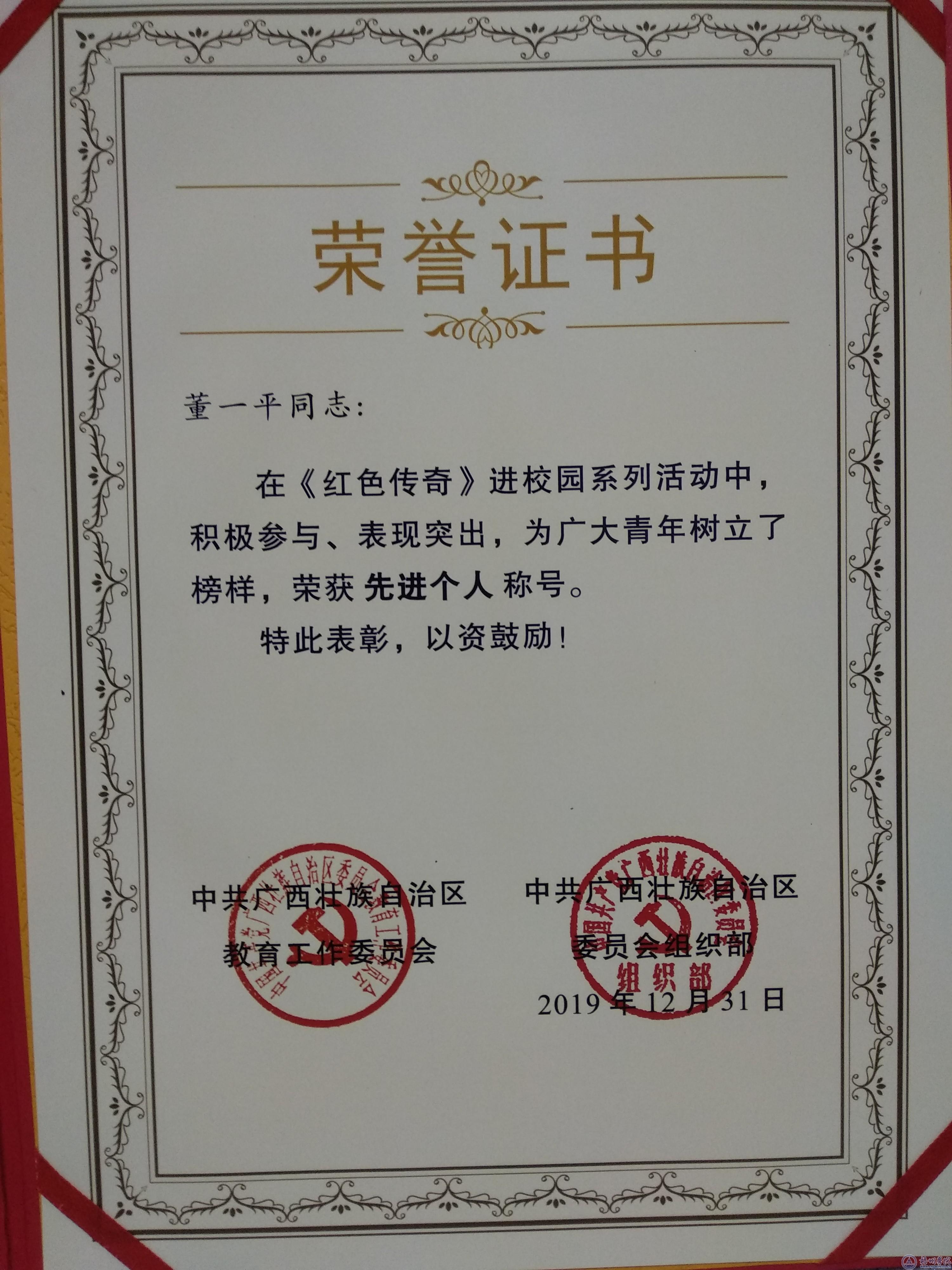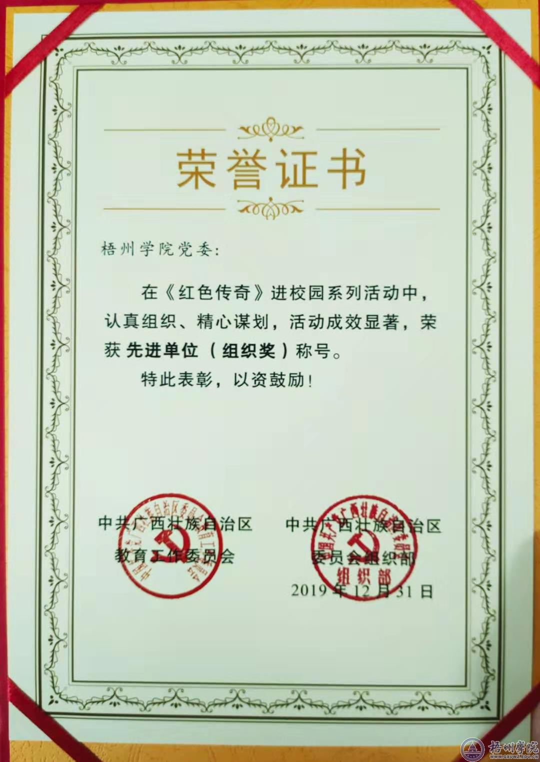 1月7日,由自治区党委组织部主办的“不忘初心、牢记使命”主题教育《红色传奇》进校园系列活动研讨会暨表彰活动在广西党员干部科教信息园举行。学校党委荣获《红色传奇》进校园系列活动先进单位奖,宝石与艺术设计学院2016级学生董一平荣获先进个人奖。