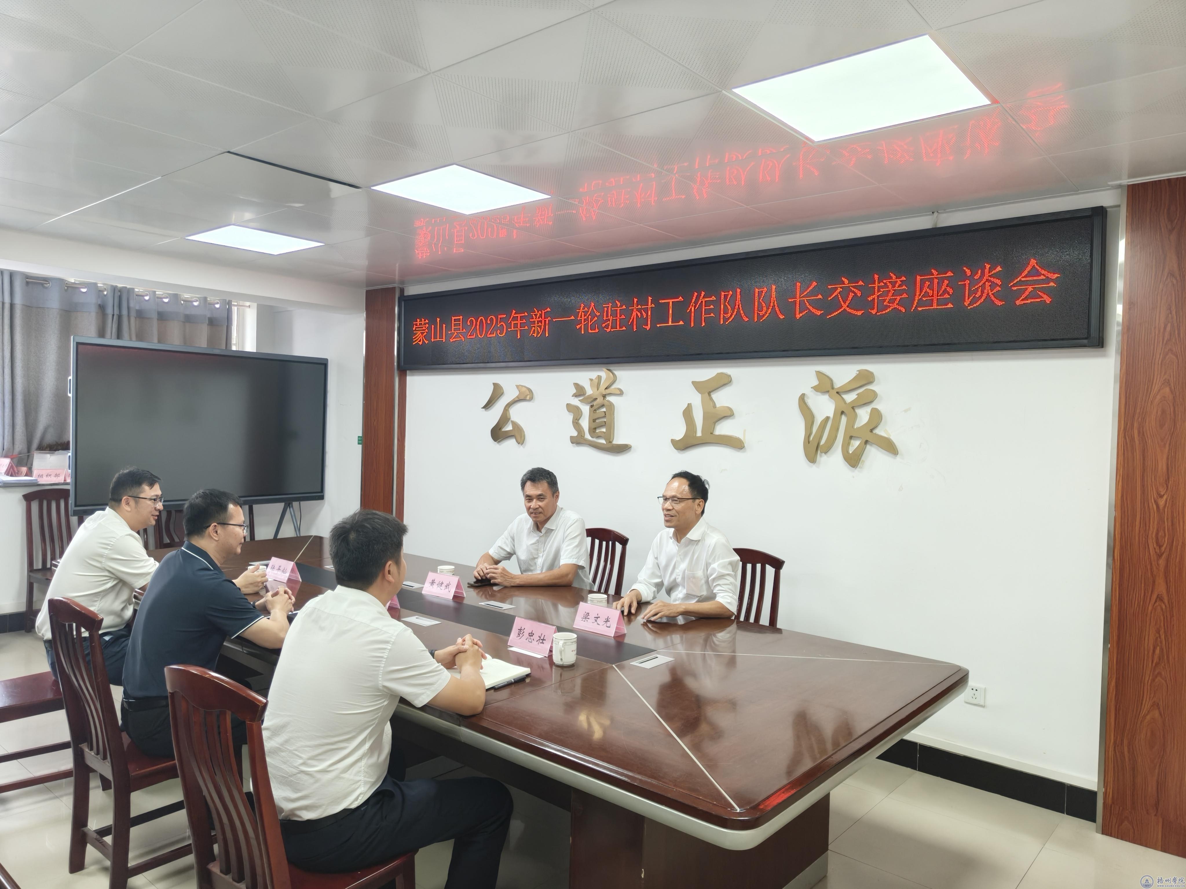 5月15日,学校党委常委、组织部部长黄健武带领新任驻村工作队队长梁文光,与现任蒙山县委常委,副县长、县驻村工作队队长李泽庆在蒙山县进行工作交接。蒙山县委常委、组织部部长陆平灿参加工作交接座谈会。