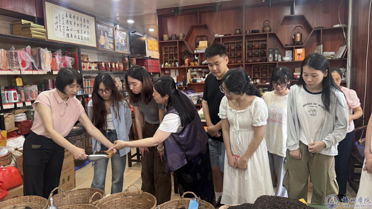 活动中,师生沉浸式体验六堡茶非遗文化:品鉴“红浓陈醇”的茶汤,聆听制作工艺与百年历史讲解,感受传统茶艺的温度与产业价值;随后调研产品展示厅及门店,聚焦爆款产品,探讨传统茶饮年轻化创新策略,洞察市场新需求。