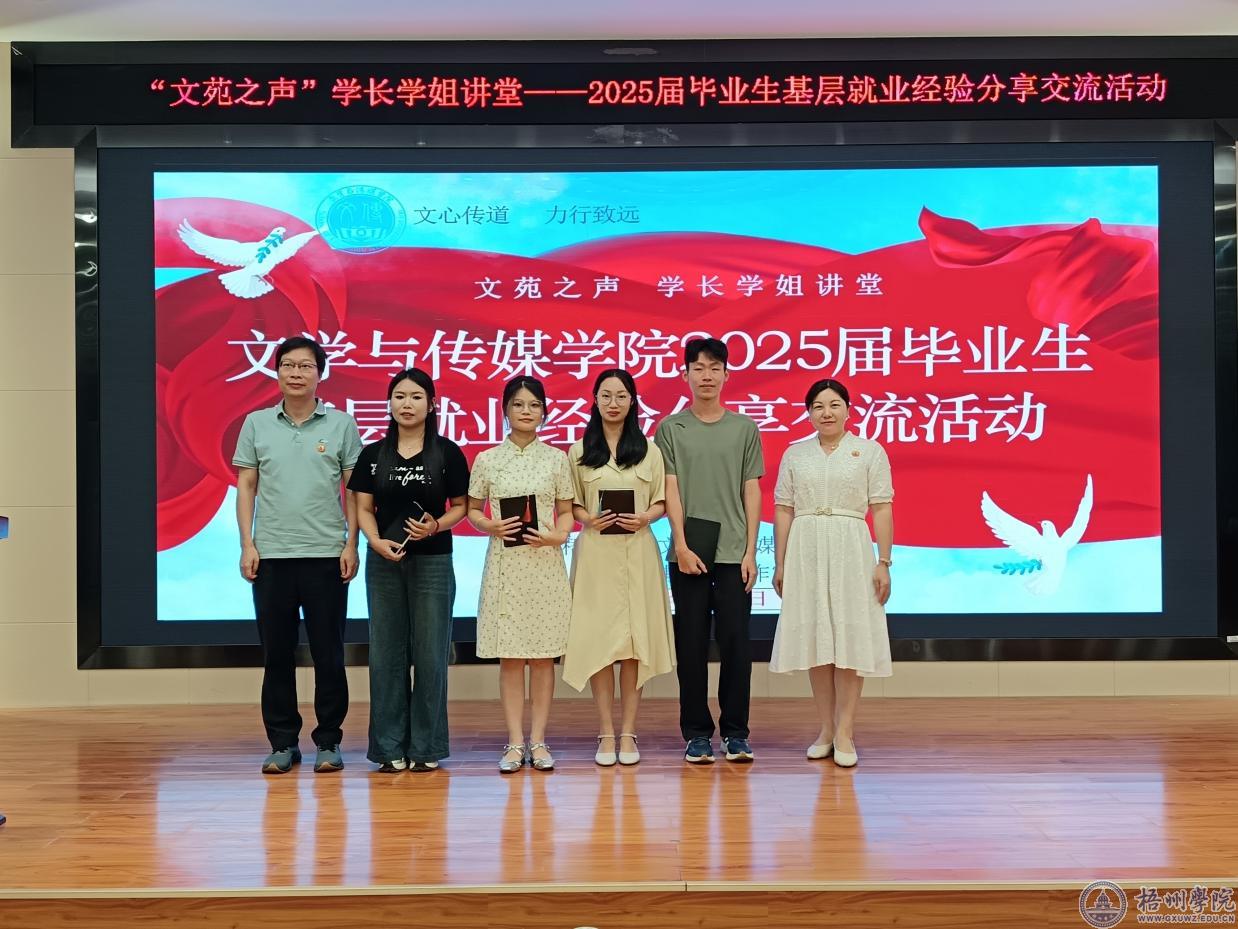 紧接着,“文苑之声”学长学姐讲堂——2025届毕业生基层就业经验分享交流活动接力开展。3位21级毕业生围绕公务员考试备考心态调整、考试方向与策略,西部计划志愿者报考准备以及对外汉语教师实习工作经历进行了分享。交流环节,学子围绕基层就业政策、适应难点提问,学长学姐细致解答。龚红梅副书记肯定了毕业生们扎根基层的担当,鼓励学子加强社会实践,将个人理想融入国家需求,让青春在基层绽放。