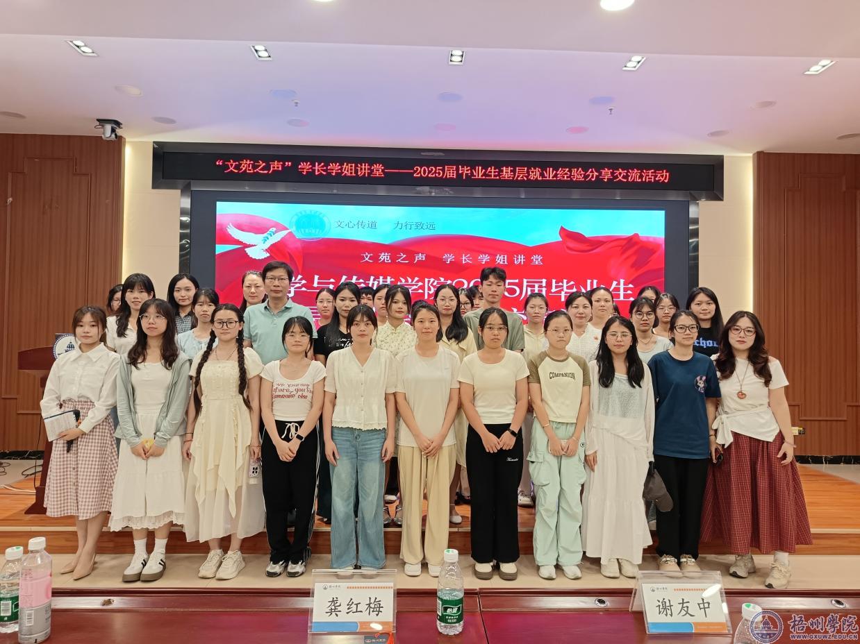 6月22日,梧州学院文学与传媒学院在明科楼一楼报告厅举办两场经验分享会,以“考研+基层就业”双引擎,为文传学子赋能,助力明晰发展方向,逐梦青春。学院党委副书记龚红梅、副院长谢友中、专业教师、辅导员、班主任、2025届考研及考公考编上岸学子代表、有考研及考公考编意向学生共160多人参加活动,共话成长。