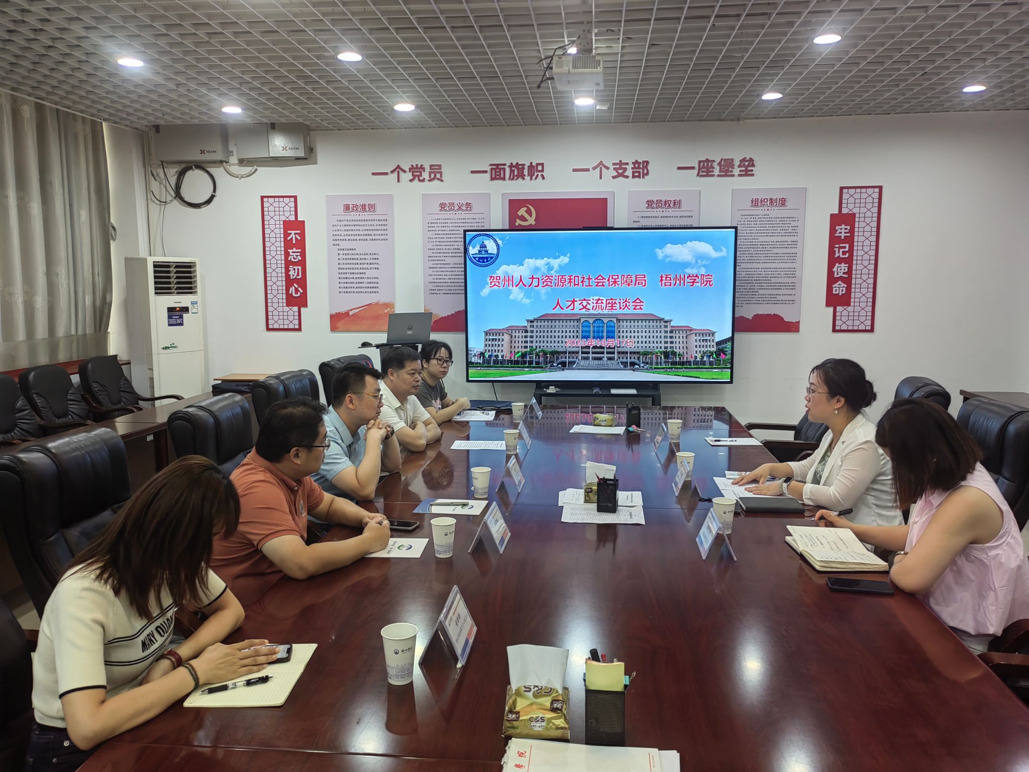 陈苏发一行先后参观了我校大学生就业指导中心、职场体验中心、国防教育成果展厅及心理健康中心。随后,双方就人才交流方面开展座谈。会上,许玉婷详细介绍了我校毕业生近三年来留桂、留梧就业情况及我校贺州生源及就业情况。陈苏发副局长则重点介绍了贺州市的产业发展布局、人才政策及就业市场需求。双方一致认为,校地合作潜力巨大,并希望通过此次交流,为梧州学院学子精准引流,定向推送贺州优质企业招聘岗位,及与我校建立常态化的交流合作。
