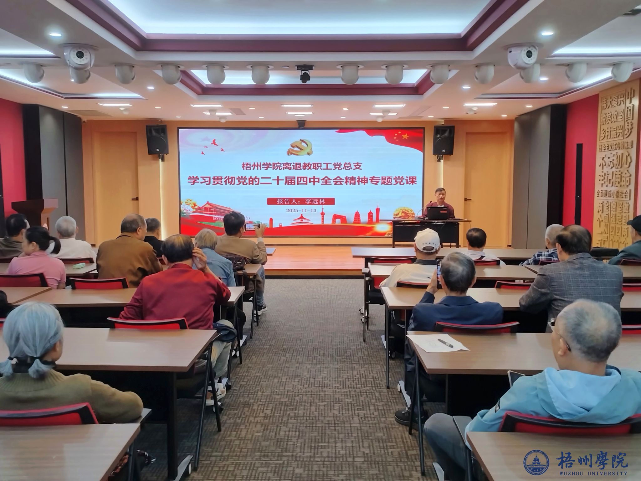 11 月13 日下午,离退休教职工党总支在梧州市党群服务中心开展学习贯彻党的二十届四中全会精神专题党课。党课由党总支副书记李远林主讲。