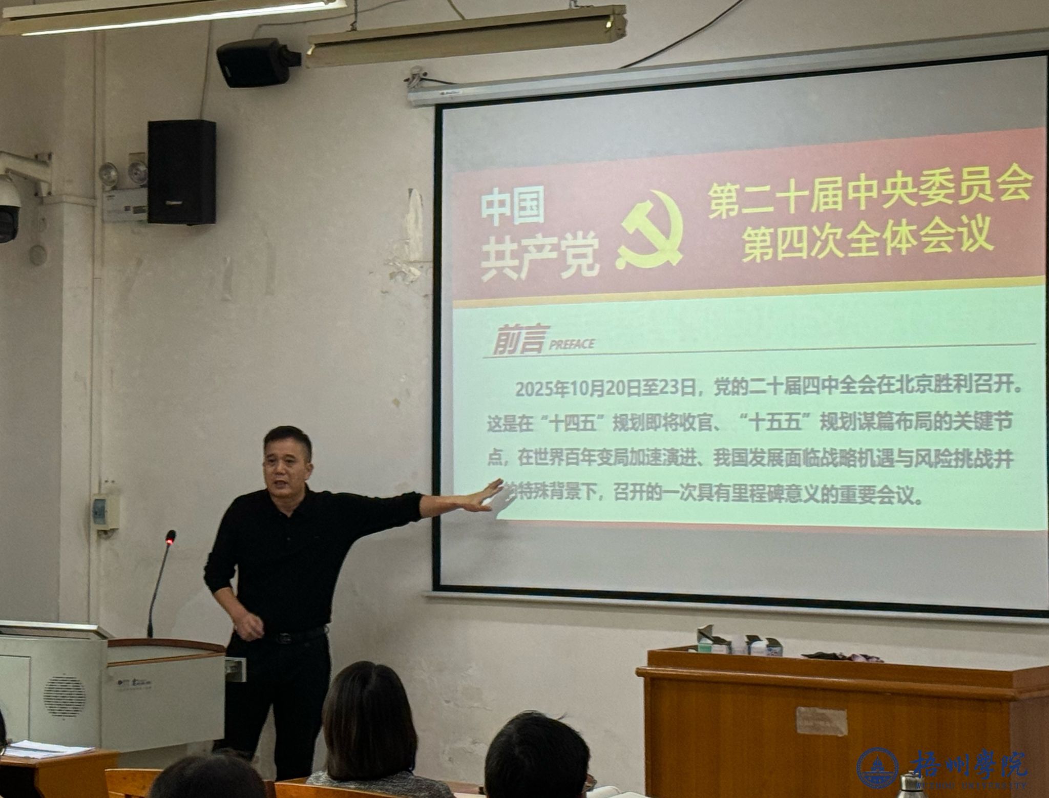 会上,唐景成院长围绕全会的重大历史意义、现实意义和理论意义,系统解读了全会审议通过的《中共中央关于制定国民经济和社会发展第十五个五年规划的建议》核心要义。唐院长提出三点要求:一是筑牢理论根基,将全会精神融入学科建设核心,聚焦中国式现代化理论体系这一重大创新成果,深化马克思主义理论学科内涵建设,推出有分量的研究成果,为国家战略提供理论支撑;二是强化育人实效,推动全会精神“进教材、进课堂、进头脑”,用鲜活案例和实践故事讲深、讲透党的创新理论,增强思政课的吸引力和感染力;三是锻造过硬队伍,以师德师风建设为核心,引导教师争做“经师”与“人师”相统一的表率,让全会精神落地生根。