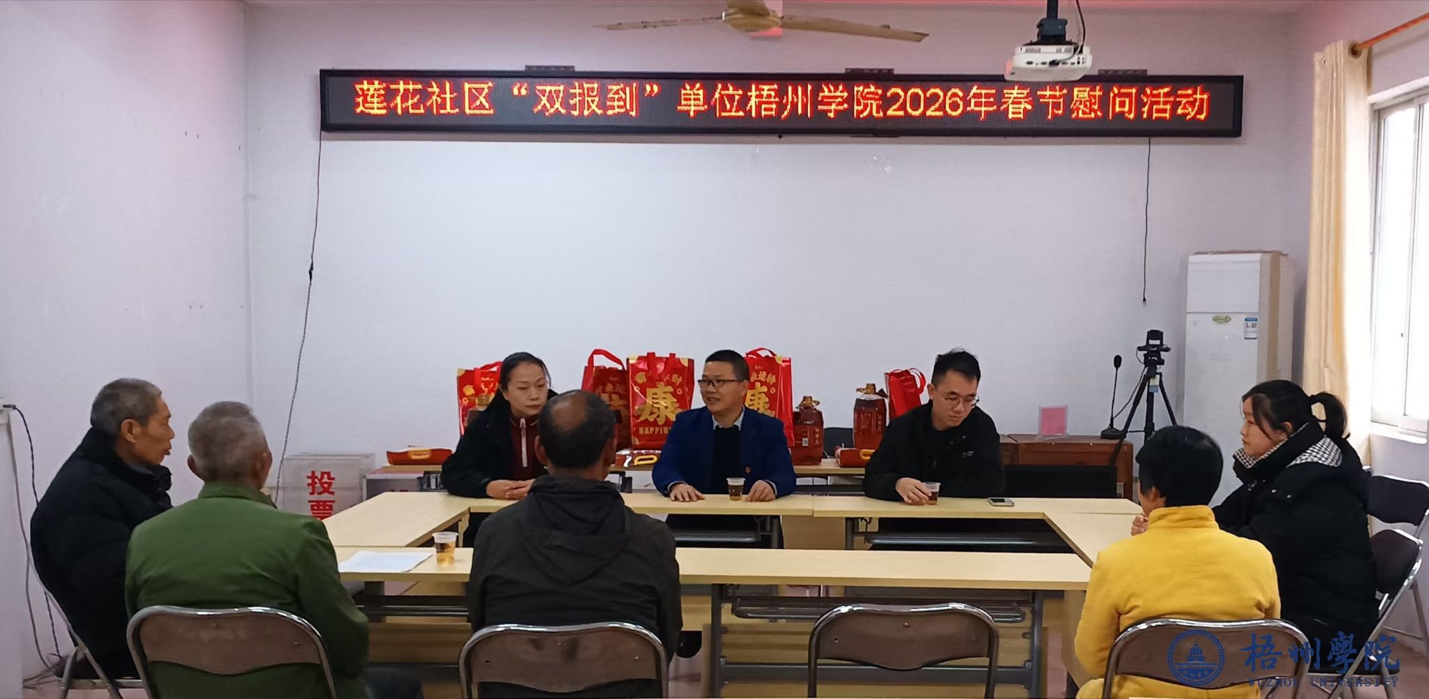 2月9日,学校赴梧州市万秀区莲花社区开展“双报到”春节走访慰问活动,对帮扶共建单位莲花社区的困难党员、群众进行亲切慰问,详细了解他们的生活情况,与他们叙话家常,送去学校对辖区困难党员群众的关心和关怀,并致以节日的问候和诚挚的祝福。学校党委组织部副部长卢桂吉参加活动。