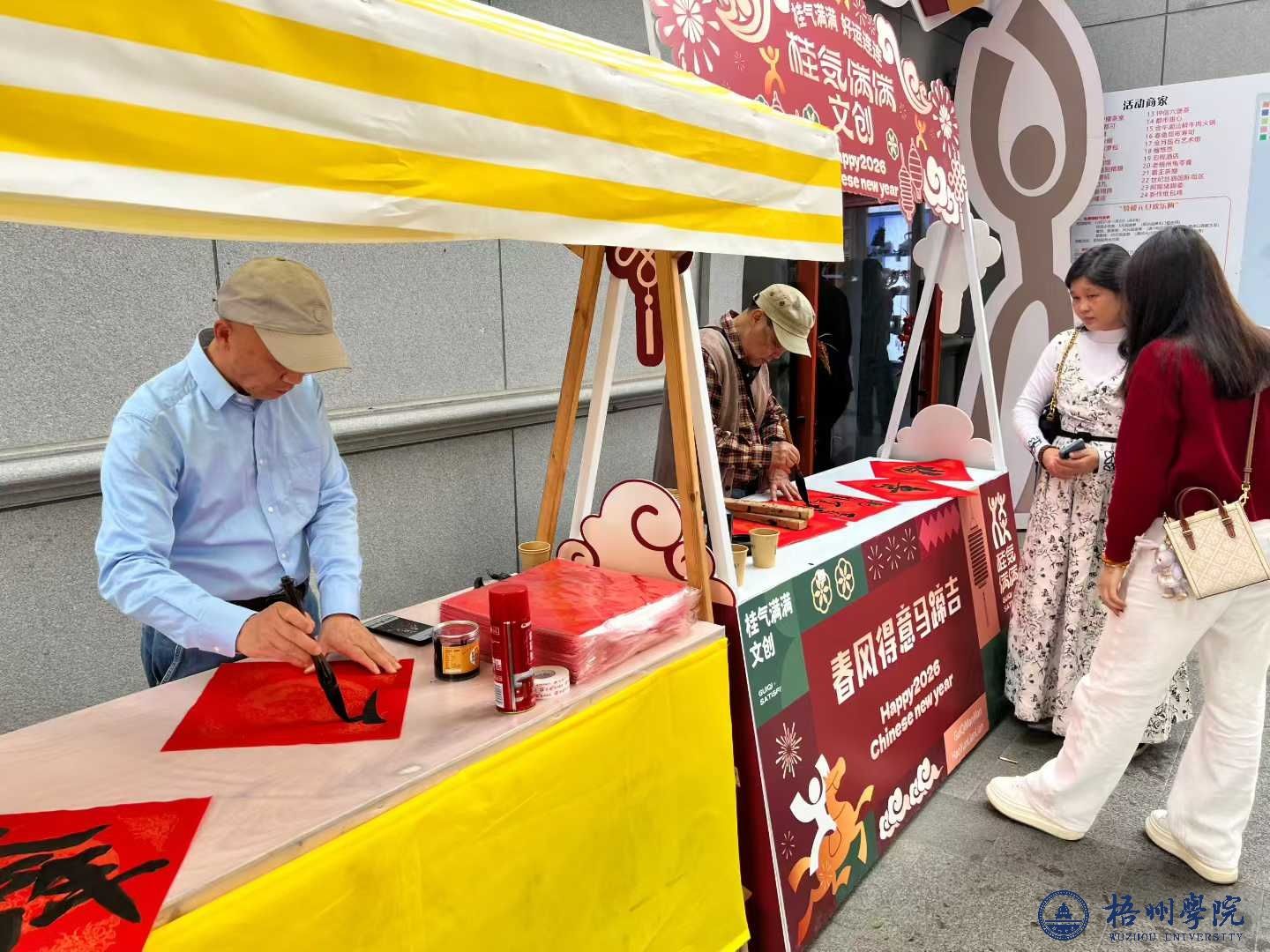 为向广大市民游客传递温暖真挚的新春祝福,给梧州骑楼城营造热烈浓厚的新春氛围,大年初五与初七两天,我校退休党员参加梧州骑楼城2026年春节“桂气满满”文创活动,在核心区域十字街口为市民和游客免费题写福字,送上新春美好祝愿。