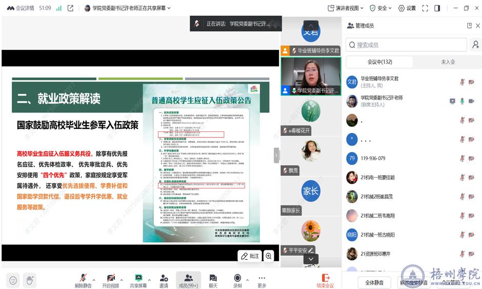 2月19日晚,机械与资源工程学院通过腾讯会议平台召开2025届毕业生就业工作家长会。学院党委副书记许玉婷、毕业班辅导员及全体2025届毕业生家长参会。