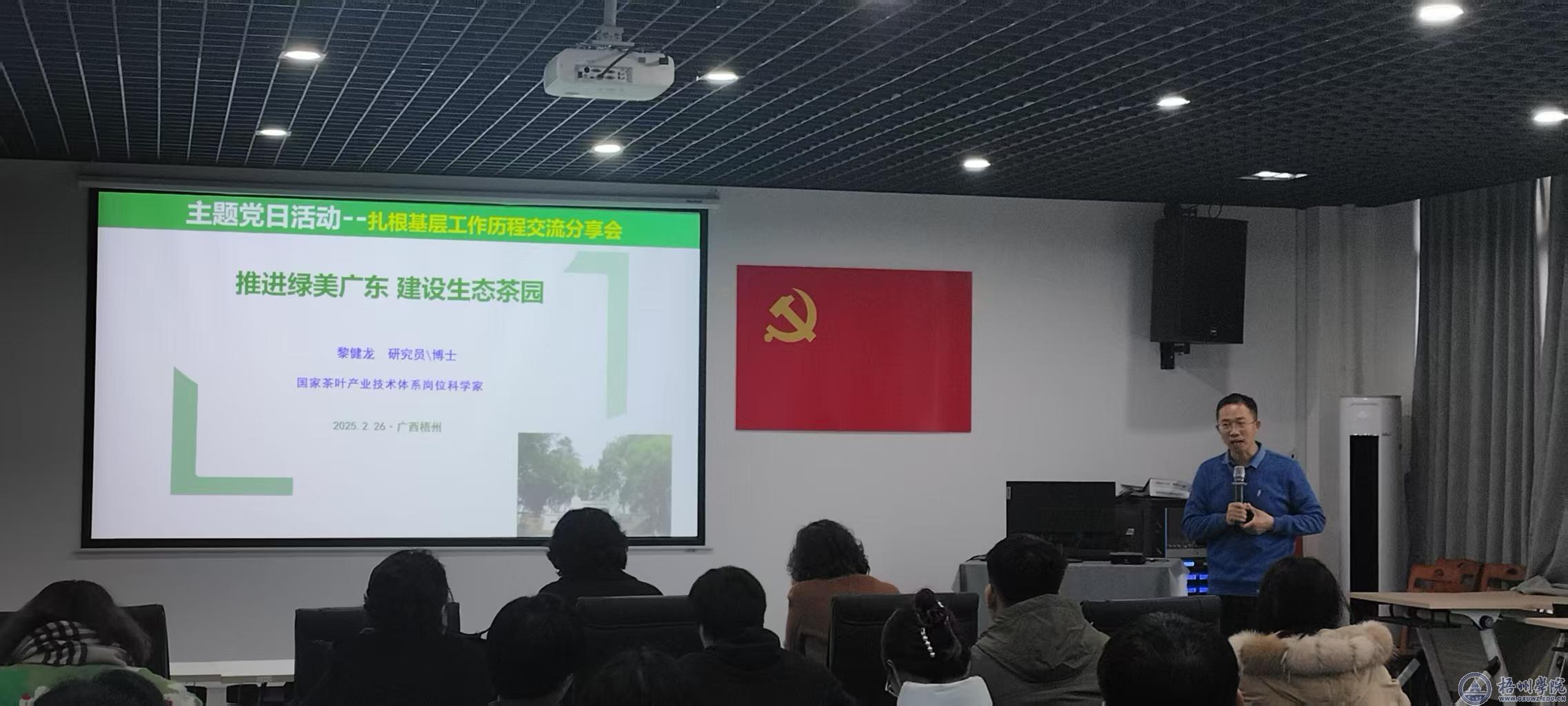 2月26日下午,校长助理黎健龙博士受邀为为食品与制药工程学院全体教师作了一场内容丰富、意义深远的经验分享会。他以“推进绿美广东,建设生态茶园”为主题,结合多年基层工作经历,从基层实践、科研初心、扎根基层、虚心学习、勤恳工作等方面,详细分享了建设生态茶园的宝贵经验和丰硕成果。