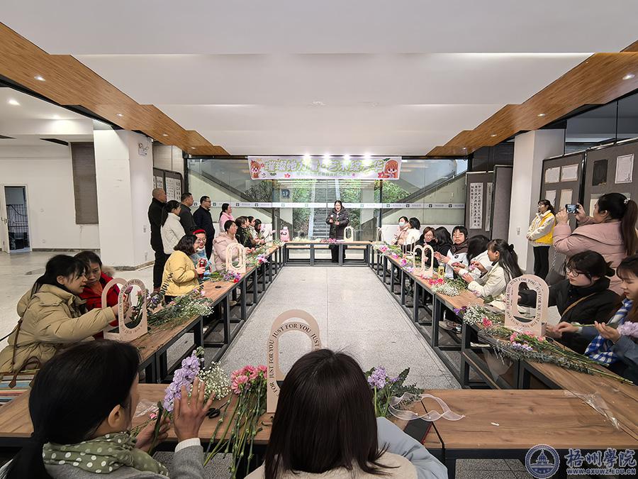 活动在韦天峰、欧广明的致辞中拉开序幕。艺术插花环节,在插花师的带领和讲解下,女性代表们精心设计了自己的插花作品,并分享了个人的感悟;参观宝石文化博物馆环节,沉浸式的参观,让参与者近距离的欣赏天然宝石、宝石艺术设计作品的风采,深入解了梧州人工宝石产业的发展历史,领略了艺术设计与本土特色产业融合的魅力。活动的高潮是全体人员在梧州学院体育馆三楼进行的集体舞蹈展示,参与者在欢快热烈的氛围中展现了女性的活力与风采。