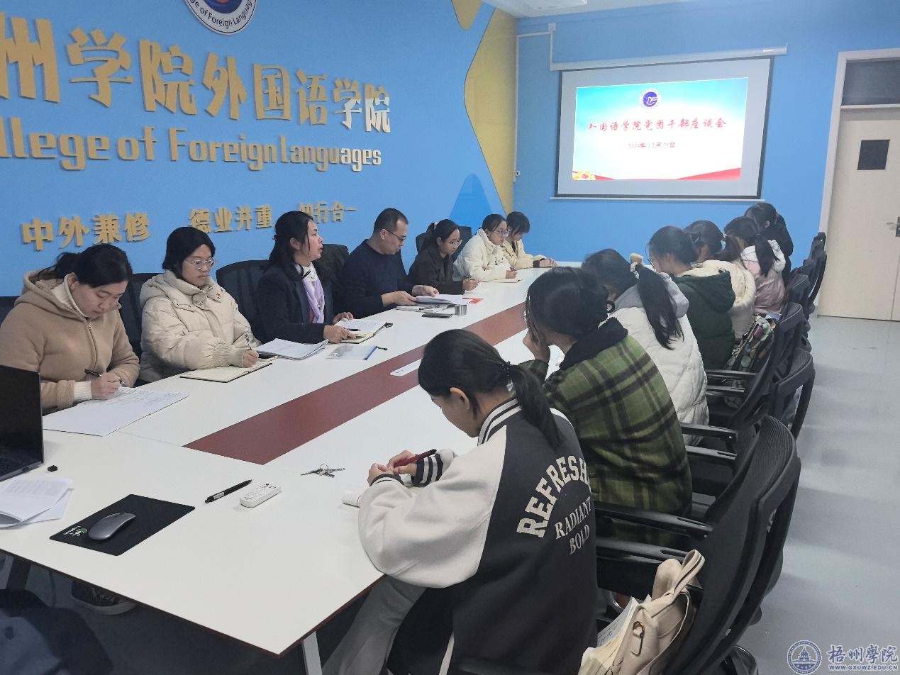 12月25日,外国语学院召开团学干部座谈会。学院党委书记朱宇乾、党委副书记韦翠兰以及党委组织员、全体辅导员、党建中心、学生会、青年志愿者分会的学生干部参加座谈。
