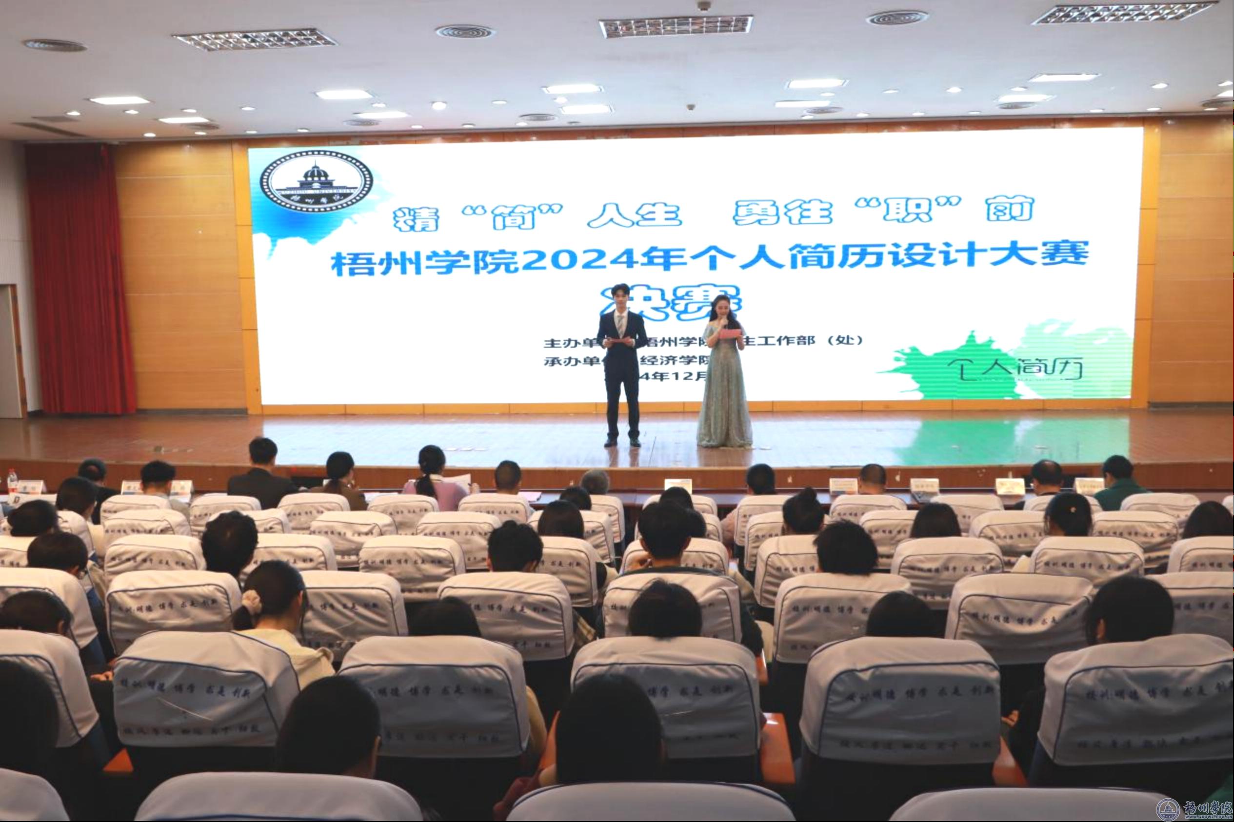 12月6日晚,我校在明理楼一楼学术报告厅举办“精‘简’人生,勇往‘职’前”梧州学院2024年个人简历设计大赛决赛。学生工作部(处)、二级学院分管学生工作领导,参赛选手、指导教师、毕业班辅导员及学生代表参加活动。特邀广西翅冀钢铁有限公司、国龙大酒店相关人事部门负责人,部分二级学院分管学生工作领导担任本次比赛决赛评委。