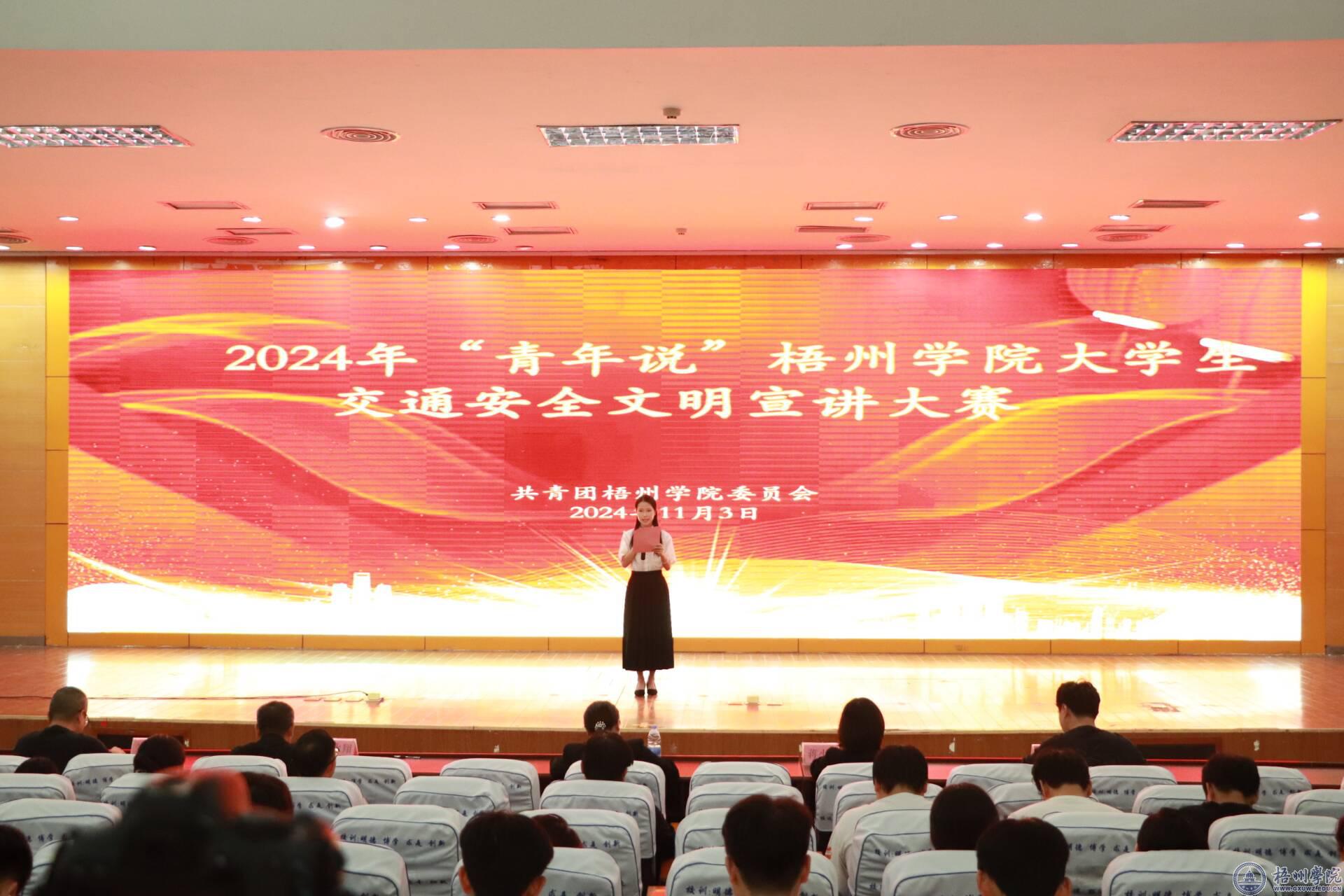 11月3日晚,2024年"青年说"梧州学院大学生交通安全文明宣讲大赛在明理楼学术报告厅举行。校团委主要负责人和相关老师、部分二级学院团委负责人、学生代表共400多人观看比赛。