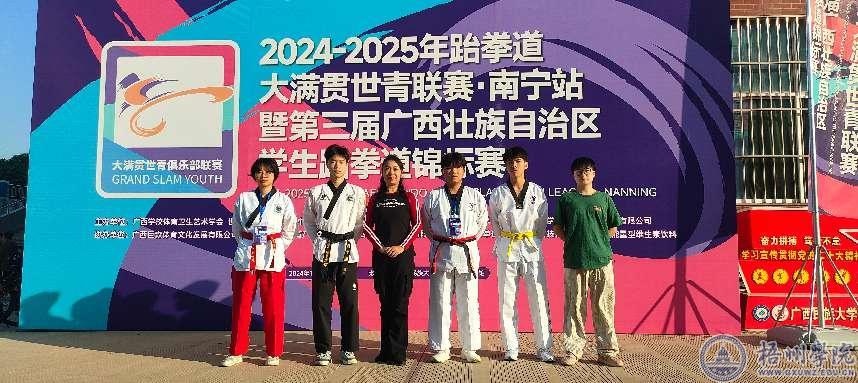 11月8日至10日,2024-2025年跆拳道大满贯世青联赛(南宁站)暨第三届广西壮族自治区学生跆拳道锦标赛落下帷幕,我校跆拳道协会参赛师生经过两天的艰苦奋战,取得优异的成绩。其中,跆拳道协会学生庄元摘得个人竞技高校男子乙组87kg公斤级冠军,张昭贤摘得个人品势高校男子甲组亚军,张琼月摘得个人竞技高校女子甲组57kg公斤级季军,潘能扬摘得个人竞技高校男子甲组63kg公斤级季军,黄晗津摘得个人竞技高校男子丙组63kg公斤级第五名。