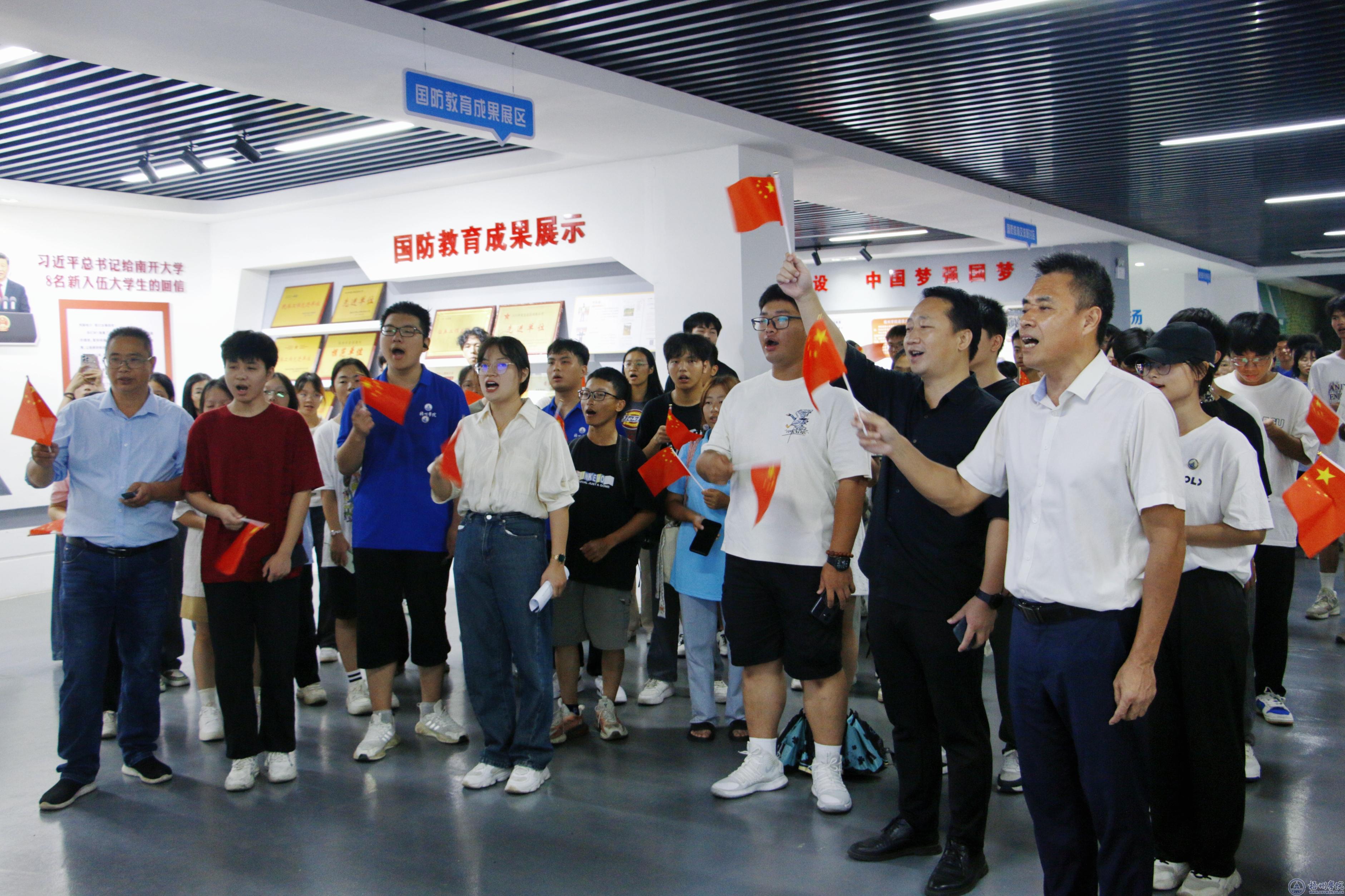仪式后,师生代表参观学校国防教育展厅,深切感受祖国在国防建设方面取得的成就和强大实力。参观中,全体人员齐声合唱《歌唱祖国》,歌声中饱含对祖国的无限热爱与深情祝福,充分展现了梧院师生坚定的理想信念和爱国情怀。