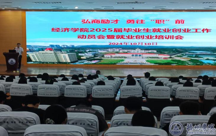 10月10日下午,经济学院在明理楼学术报告厅召开“弘商励才,勇往‘职’前”2025届毕业生就业创业工作动员会暨就业创业培训会。学院领导、毕业班辅导员、全体2025届毕业生参加会议。