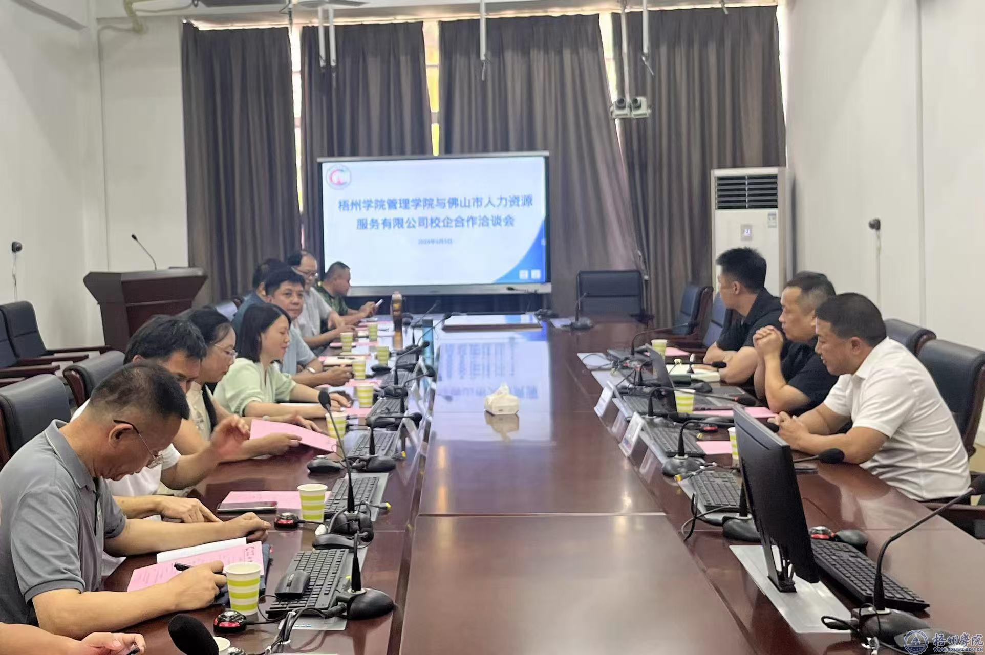 会上,学院党委书记冀宁介绍了管理学院的办学定位、专业设置、人才培养和产教融合的情况。汪国洋总经理以《社会职业需求趋势:高校专业设置及人才培养》为题作了发言,并介绍了佛山市人力资源服务有限公司的基本情况、人才招聘的需求情况。双方就校企合作的途径、形式、内容等进行了探讨和思考,并达成初步共识。
