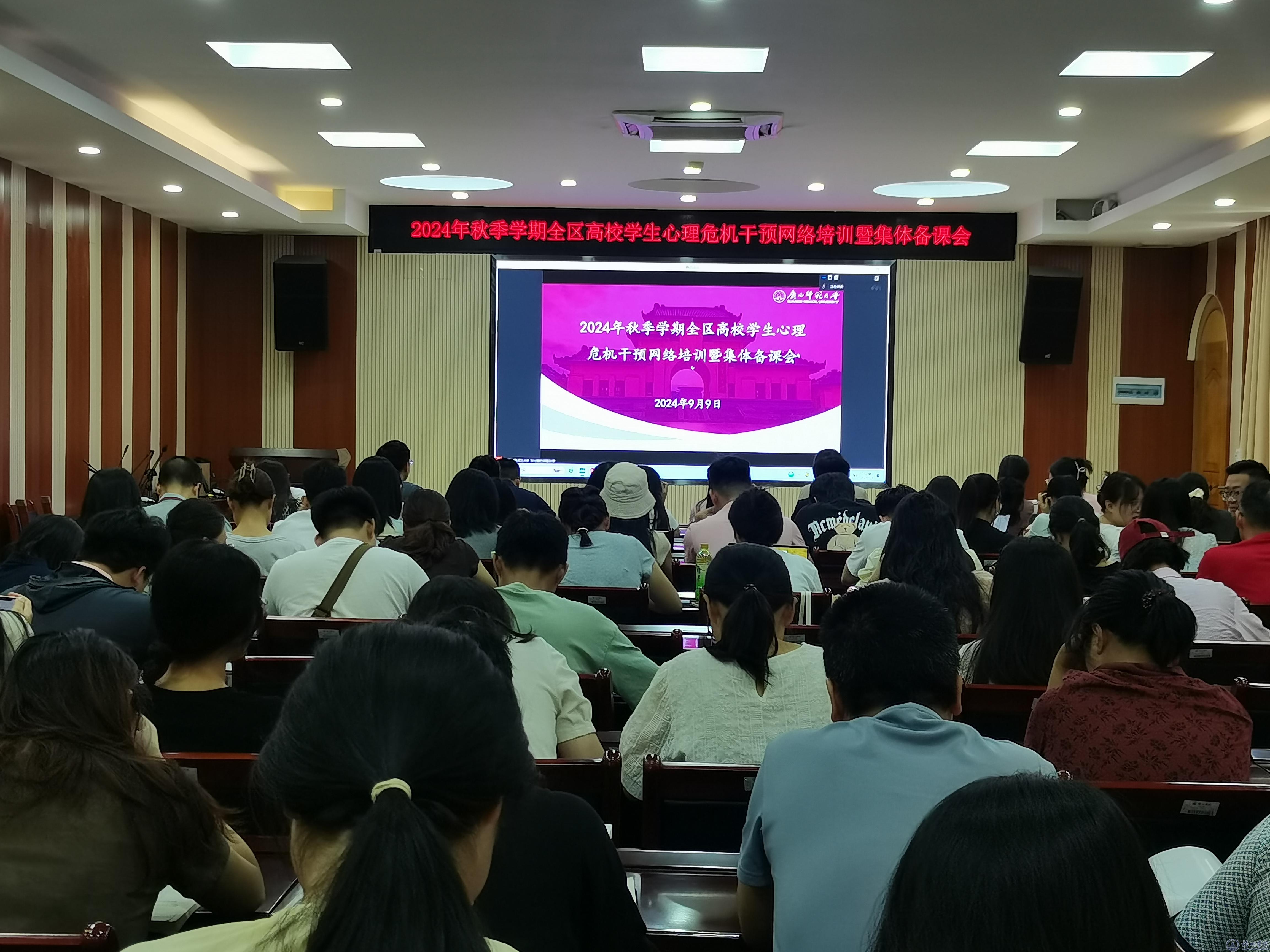 9月9日,我校组织心理健康教育专兼职教师、二级心理工作站全体人员、辅导员、班主任等100多人在明理楼七楼视频会议室参加2024年秋季学期全区高校学生心理危机干预网络培训暨集体备课会。