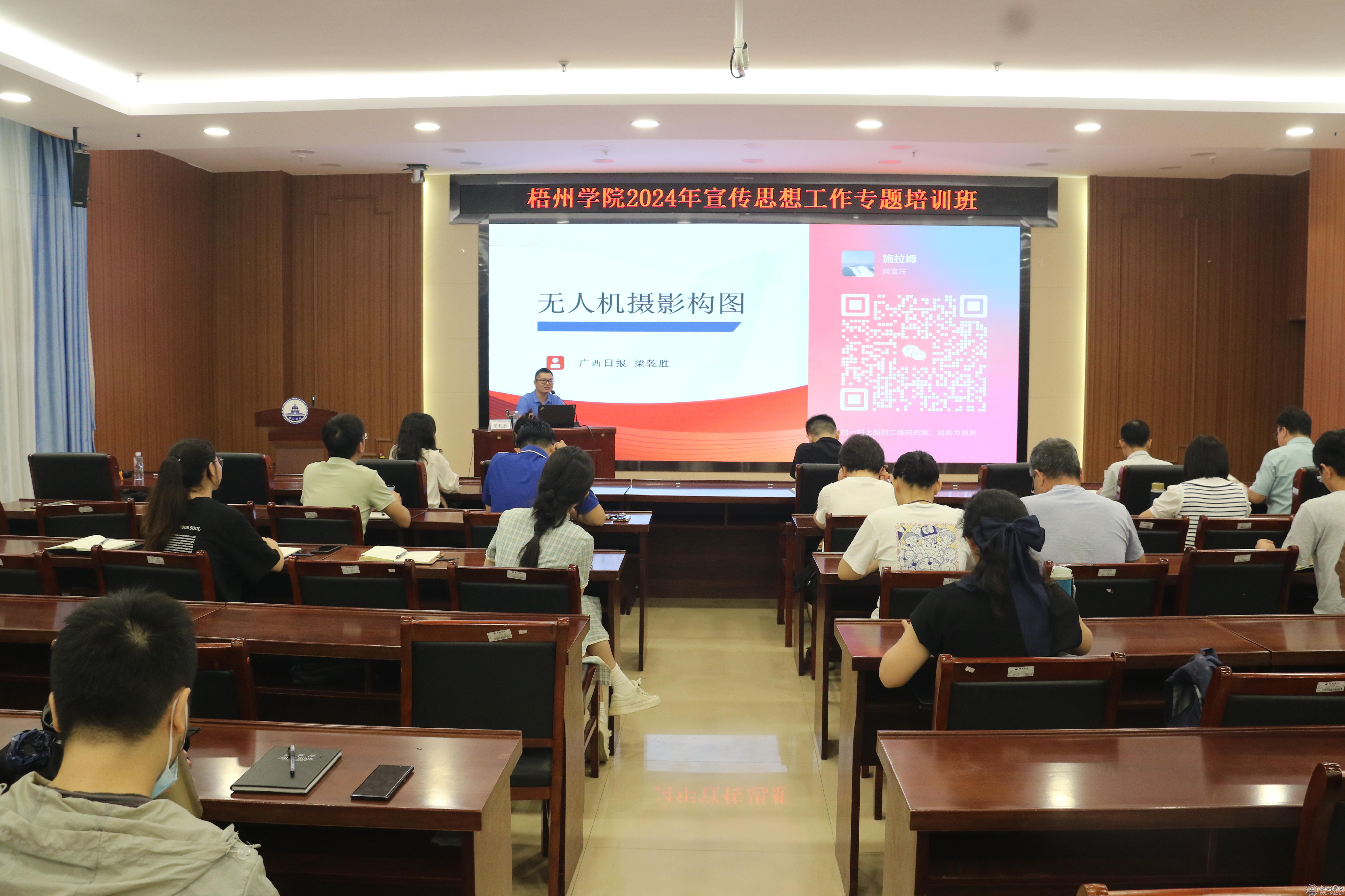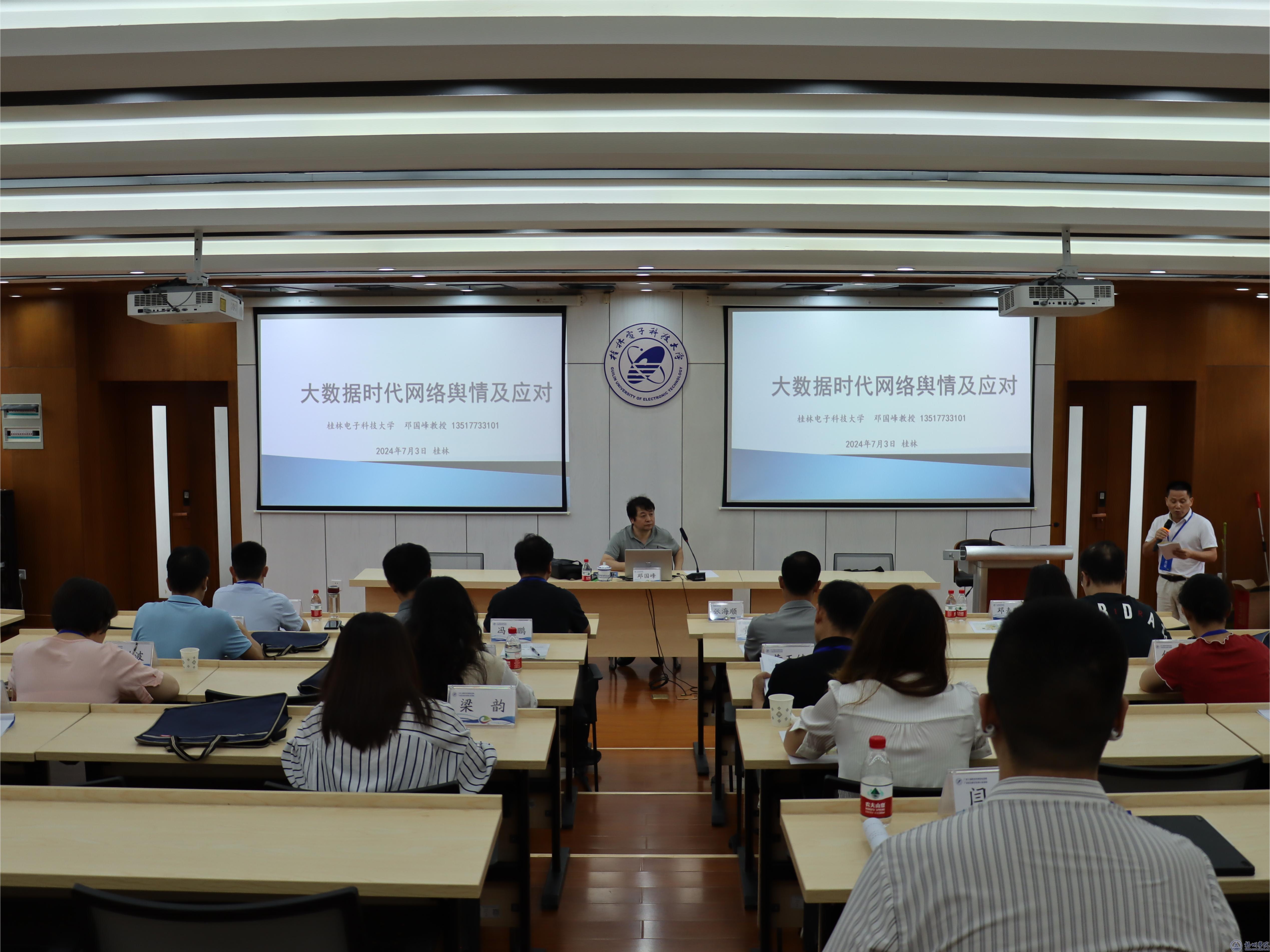 广西日报社梧州站负责人梁乾胜以《如何做好新形势下的高校宣传思想文化工作》为题,通过无人机拍摄、新闻摄影引发的舆情等实例,深入阐述了在新形式下做好新闻工作的要点和方法。梧州日报社产业经营部主任张渊腾以《新闻采访和稿件撰写体会分享》为题,从对新闻宣传工作的认识、深度报道的定义、形式以及新闻写作案例分析等多个方面进行了详细介绍。桂林电子科技大学马克思主义学院院长、二级教授邓国峰以《基于大数据的网络舆情分析与危机处理》为题,为学员们带来了大数据时代下舆情分析与危机处理的新思路和新方法。桂林电子科技大学融媒体中心主任王再新以《媒体融合时代的正面舆论引导与网络宣传》为题,分享了媒体融合时代的创新宣传理念和策略。
