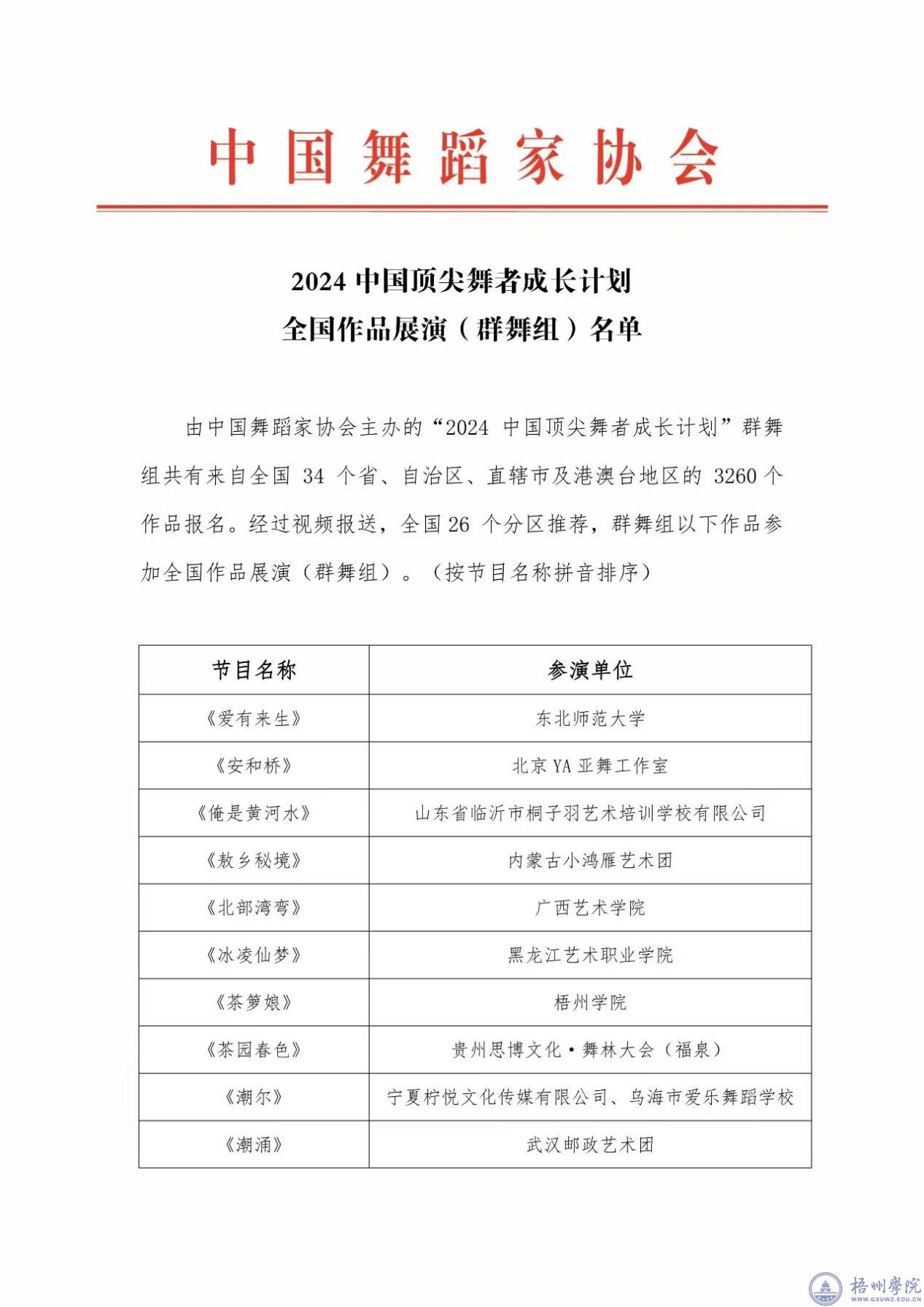 我校教师教育学院与梧州市群众艺术馆共同打造的舞蹈作品《茶箩娘》入选“2024中国顶尖舞者成长计划”全国作品展演。在7月10日揭晓的展演名单中,《茶箩娘》以其独特的艺术魅力,在众多参赛作品中脱颖而出,成为全国群舞作品的百强之一。