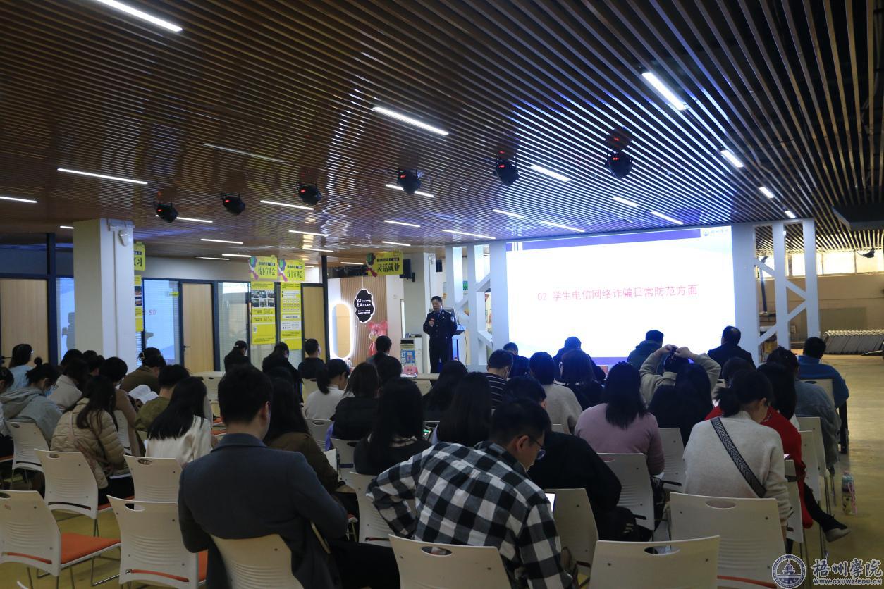 会上,梧州市公安局覃焕新警官围绕日常安全纠纷、电信网络诈骗等方面讲解防范电信诈骗的专业知识和真实案例。