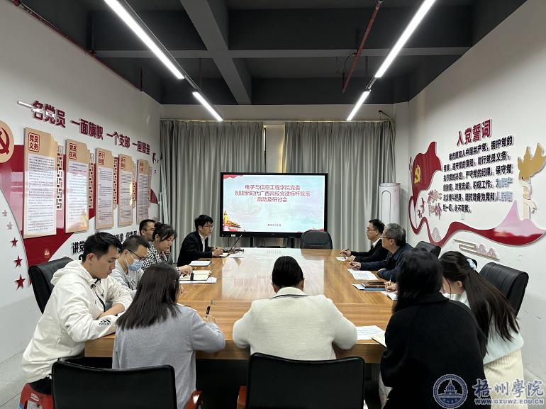 根据《自治区党委教育工委关于公布第二批新时代广西高校党建示范创建和质量创优工作培育创建单位名单的通知》(桂教工委组〔2023〕51号),电子与信息工程学院党委入选第二批新时代广西高校党建工作标杆院系培育创建单位,为了更好的加强和促进标杆院系的建设工作,12月9日下午,电子与信息工程学院在1204室召开创建新时代广西高校党建标杆院系启动及研讨会,学院全体领导班子、科级以上领导干部以及基层党支部书记参加会议。