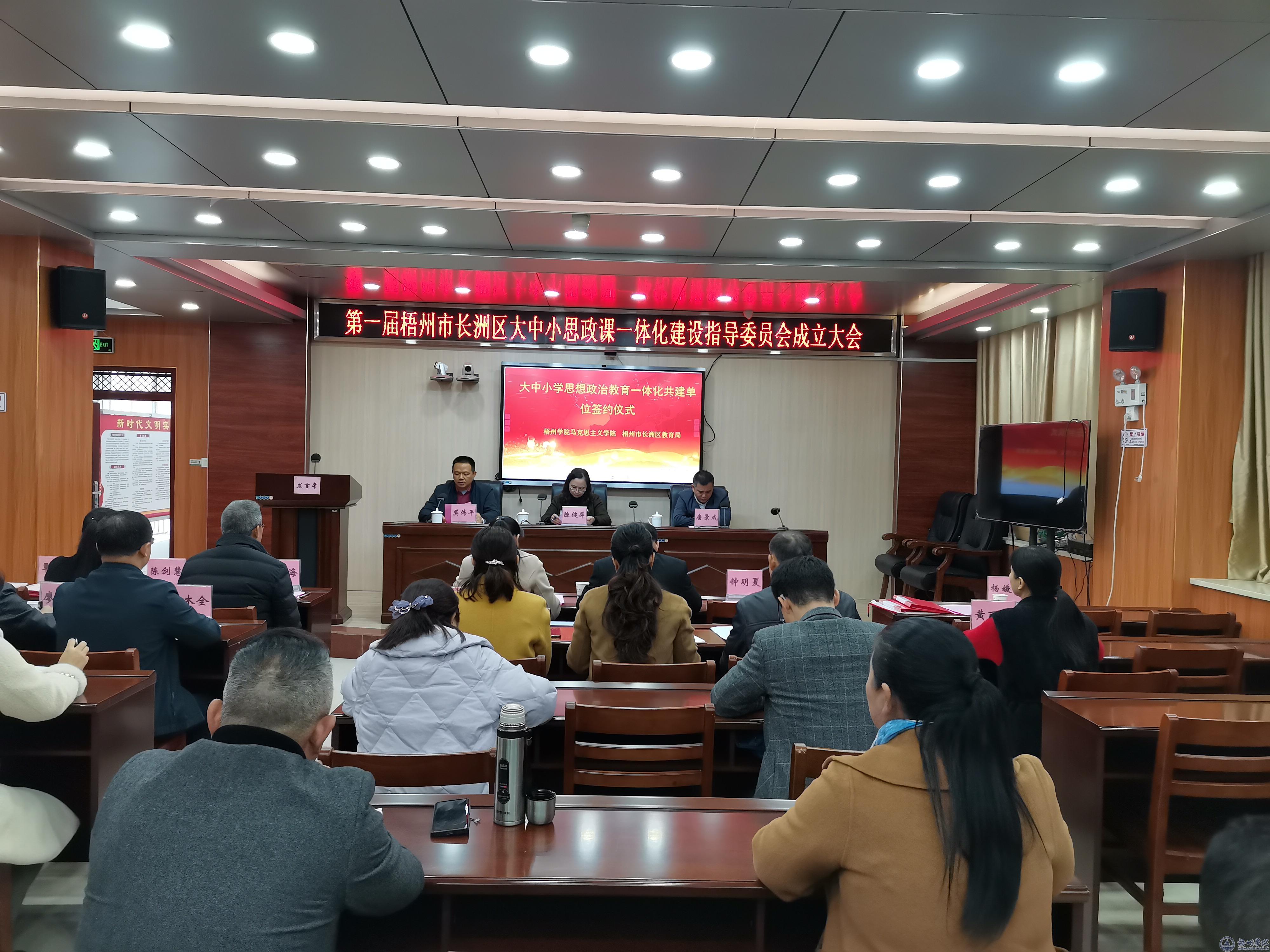 12月1日下午,梧州市长洲区大中小学思想政治教育一体化共建单位签约揭牌仪式暨共建单位第一次联席会议在长洲区教育局六楼会议室举行,马克思主义学院院长陈健萍、副院长唐景成、长洲区教育局副局长莫伟平以及有关代表参加了本次活动。