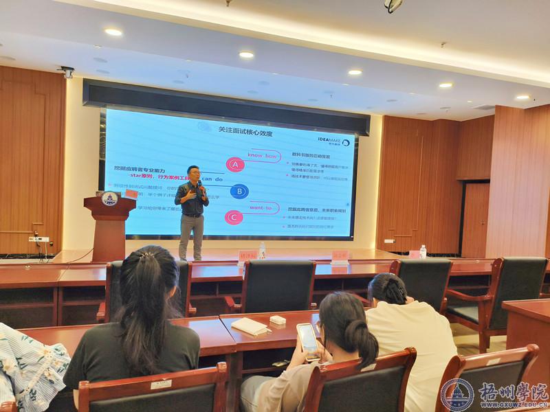 随后,我校2011届校友卢检对到会的同学进行求职技能培训。他分享了多年招聘工作中遇到的问题,重点阐述了企业招聘用人的“PPS”(Poor Power Smart)原则和求职者面试中应关注的“核心效度”,对同学们在简历制作、面试问答过程中遇到的问题做了专题讲解和互动问答,希望毕业生们认真做好准备,提升面试成功率。