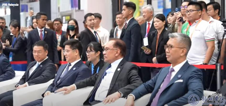 曾秦老师在开馆仪式上为自治区领导何文浩、马来西亚总理安瓦尔提供翻译服务