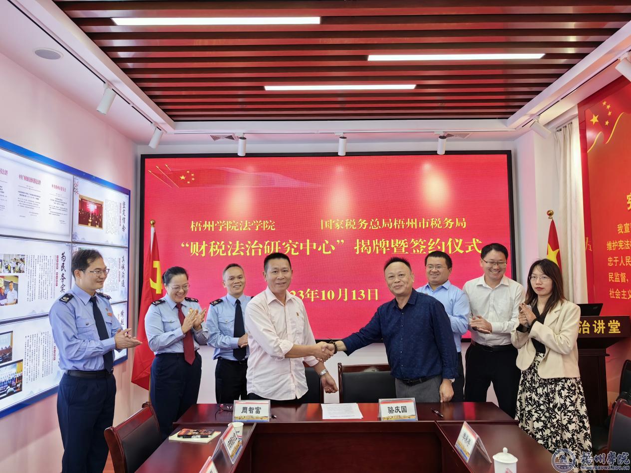 10月16日上午,“财税法治研究中心”揭牌暨签约仪式在梧州税务局法治讲堂举行。法学院院长骆庆国与梧州市税务局局长陈钜胜共同为“财税法治研究中心”揭牌。中心依托法学院的人才资源,为财税改革发展建言献策,促进梧州市财税法学理论与实践的研究。