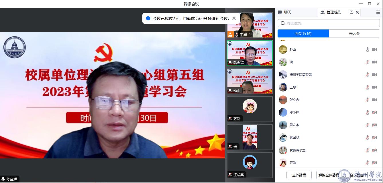 7月30日晚,校属单位理论学习中心组第五组在线上—腾讯会议召开2023年第二次专题学习会,理论学习中心组第五组全体成员参加会议。