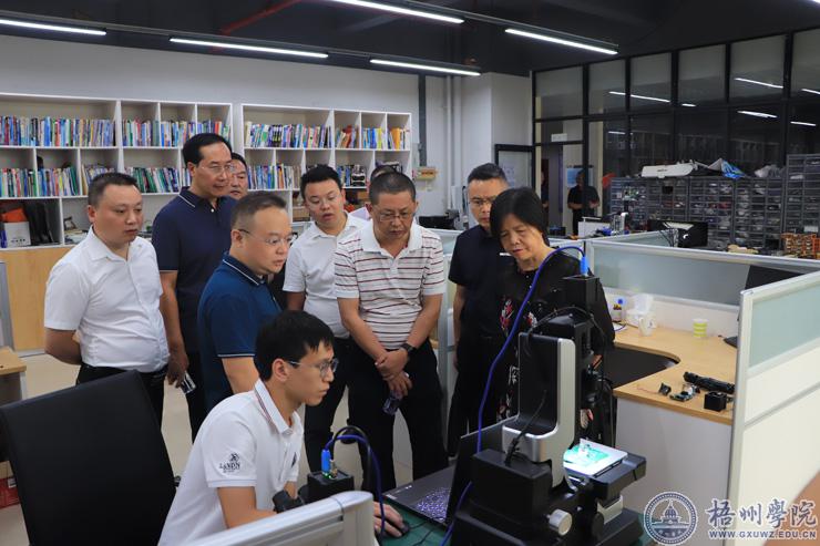 调研组一行首先来到明科楼参观调研我校广西智能显微设备工程技术研究中心、广西机器视觉与智能控制重点实验室建设有关人才引进和人才梯队建设情况。调研组一行走进实验室、研究中心,认真了解高层次人才团队建设,科研成果及成果转化等情况,对学校发挥人才优势,助力地方经济、社会发展给予了高度认同。