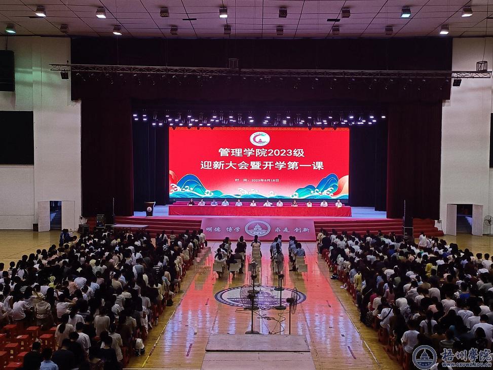 9月18日晚,管理学院在体育馆三楼举行2023级迎新大会。学院班子成员,各专业教研室室主任、教师代表、新生班主任、辅导员,梧州市公安局网安支队民警代表,管理学院2023级全体新生参加大会。