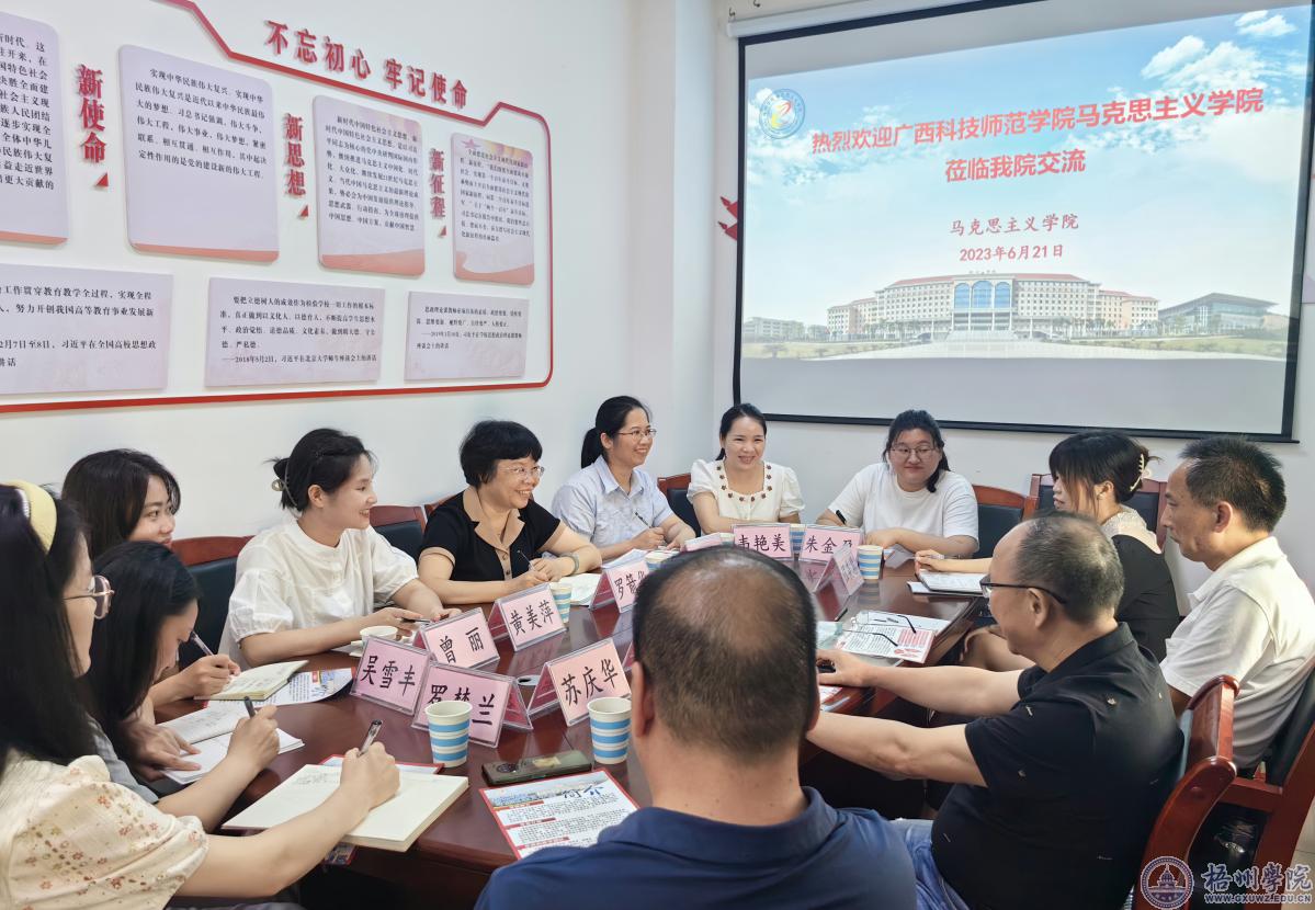 6月21日上午,广西科技师范学院马克思主义学院党总支书记罗箭华教授一行8人到马克思主义学院考察交流,学院党委书记张朝松、院长尹杰钦携教研室主任代表热情接待广西科技师范学院代表团一行。双方在卓越人才工作室进行座谈交流。