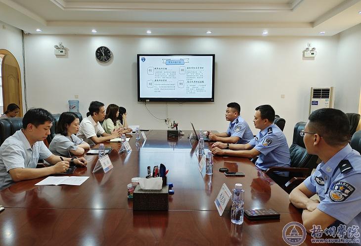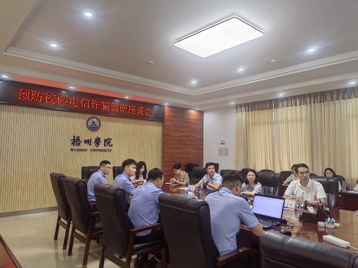 6月14日上午,管理学院、商学院联合梧州市公安局网安支队在明理楼八楼第二会议室共同举办了预防校园电信诈骗调研座谈会,梧州市公安网安支队政委陈敦鹄、管理学院党委书记冀宁、管理学院党委副书记陈兴、商学院党委副书记叶子琛以及民警代表、辅导员代表参加了本次调研座谈会。