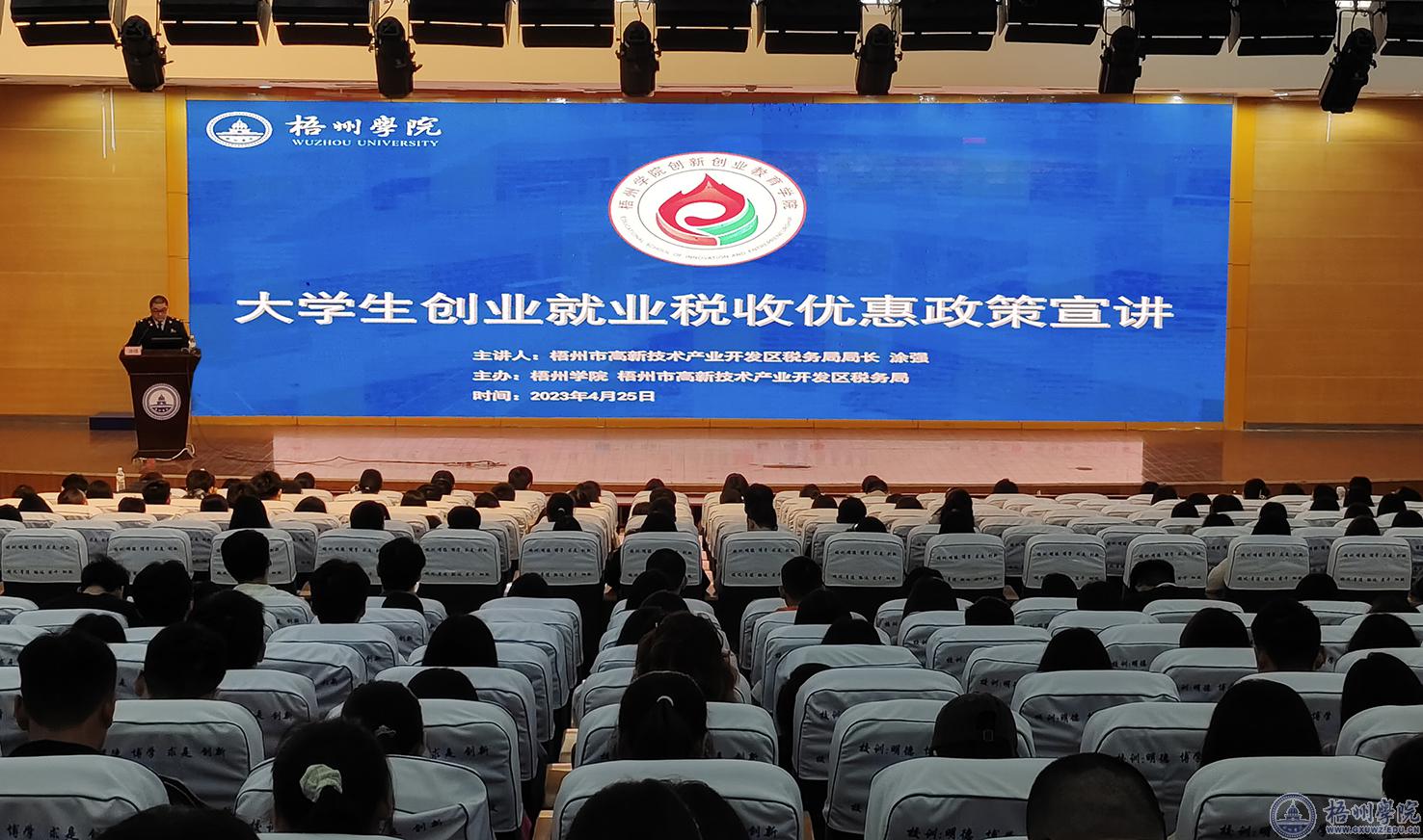 4月25日下午,创新创业教育学院在明理楼一楼学术报告厅举办“梧院双创邀您说”讲坛之大学生创业就业税收优惠政策宣讲会,邀请了梧州市高新技术产业开发区税务局局长涂强主讲。宣讲会有500多名师生参加,由创新创业教育学院院长韦衡冰主持。